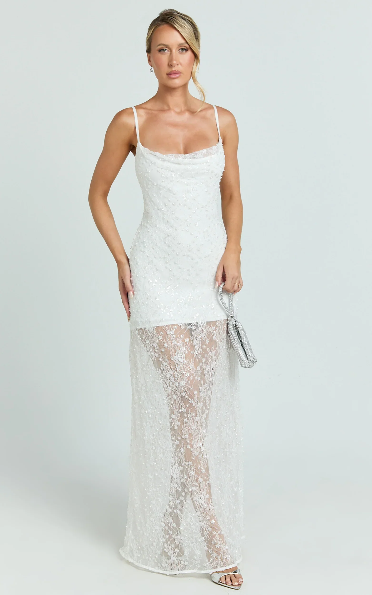 Alana Maxi Dress - Lace Sequin Cowl Neck Dress in White
