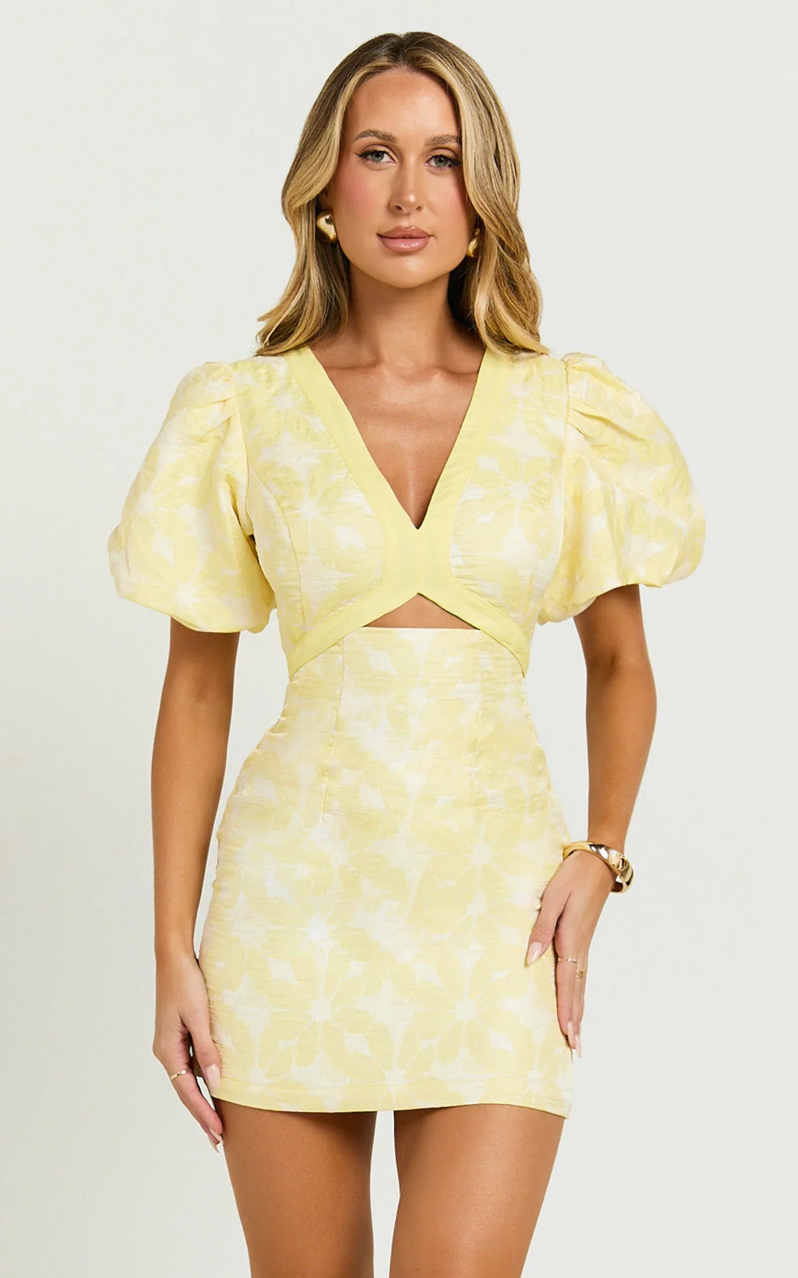 Diana Mini Dress - Jacquard Short Sleeve Cut Out Dress in Lemon