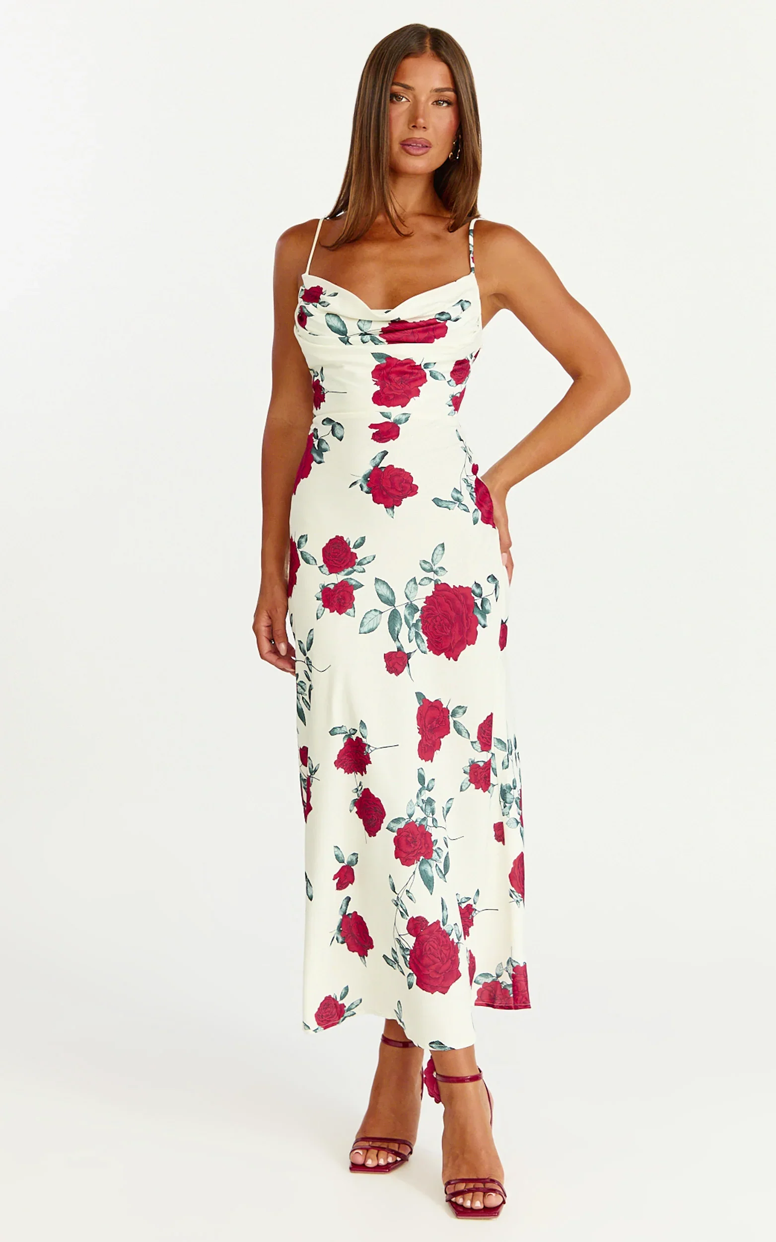 Dahlia Midi Dress - Cowl Neck A Line Dress in Scarlet Rose Print