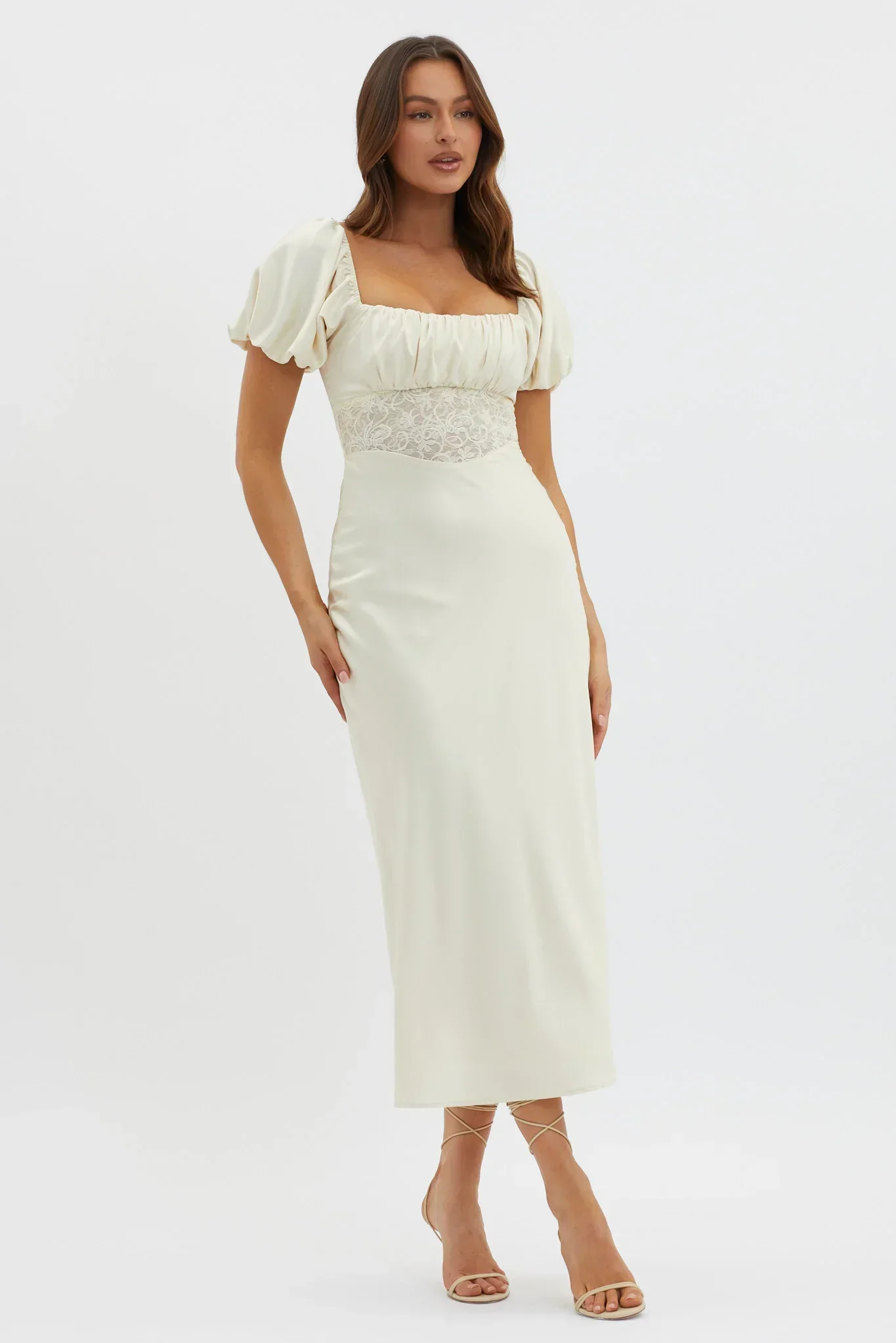Allianna Puff Sleeve Lace Waist Midi Dress Butter