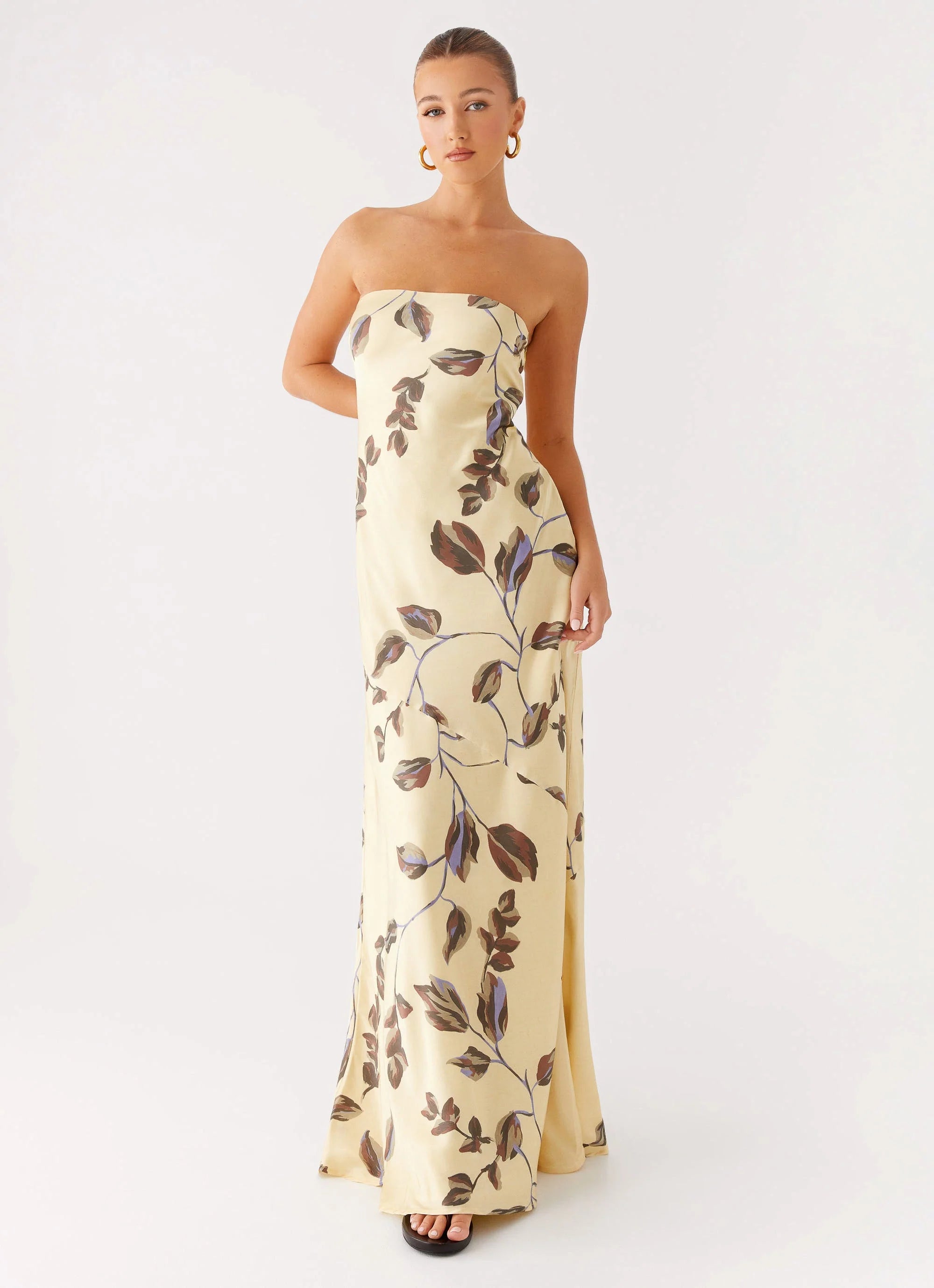 The Alisa Strapless Maxi Dress captures the magic of twilight with its flowing maxi length, exclusive floral print, and bold front metal embellishment. Finished with a low back to elevate your nighttime glow.