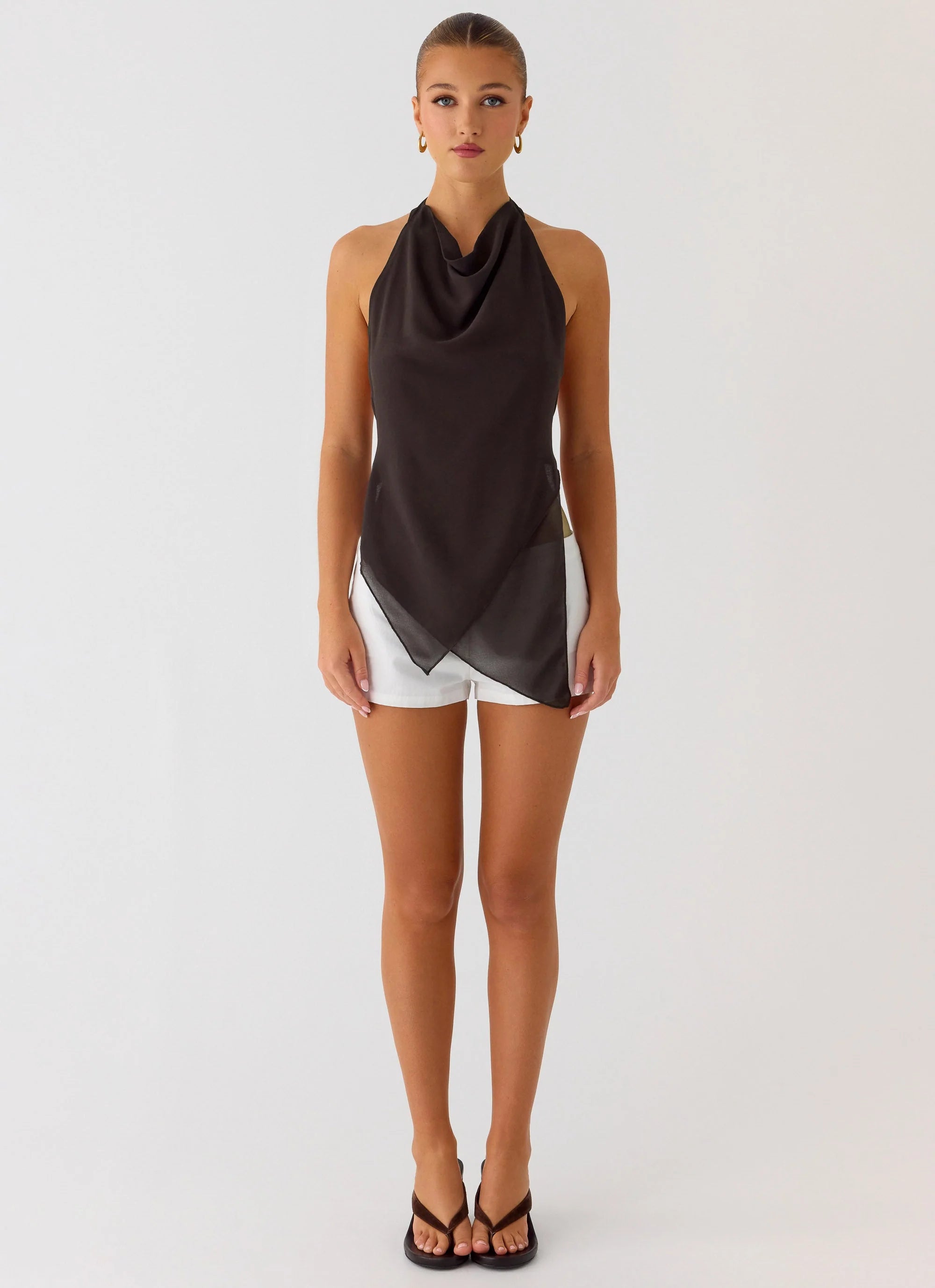 The Altego Layered Backless Top is a statement piece for sun-soaked days and vibrant nights. Featuring a halter neckline, layered design, and open back with an adjustable strap, this fully lined top effortlessly blends elegance with a playful edge.