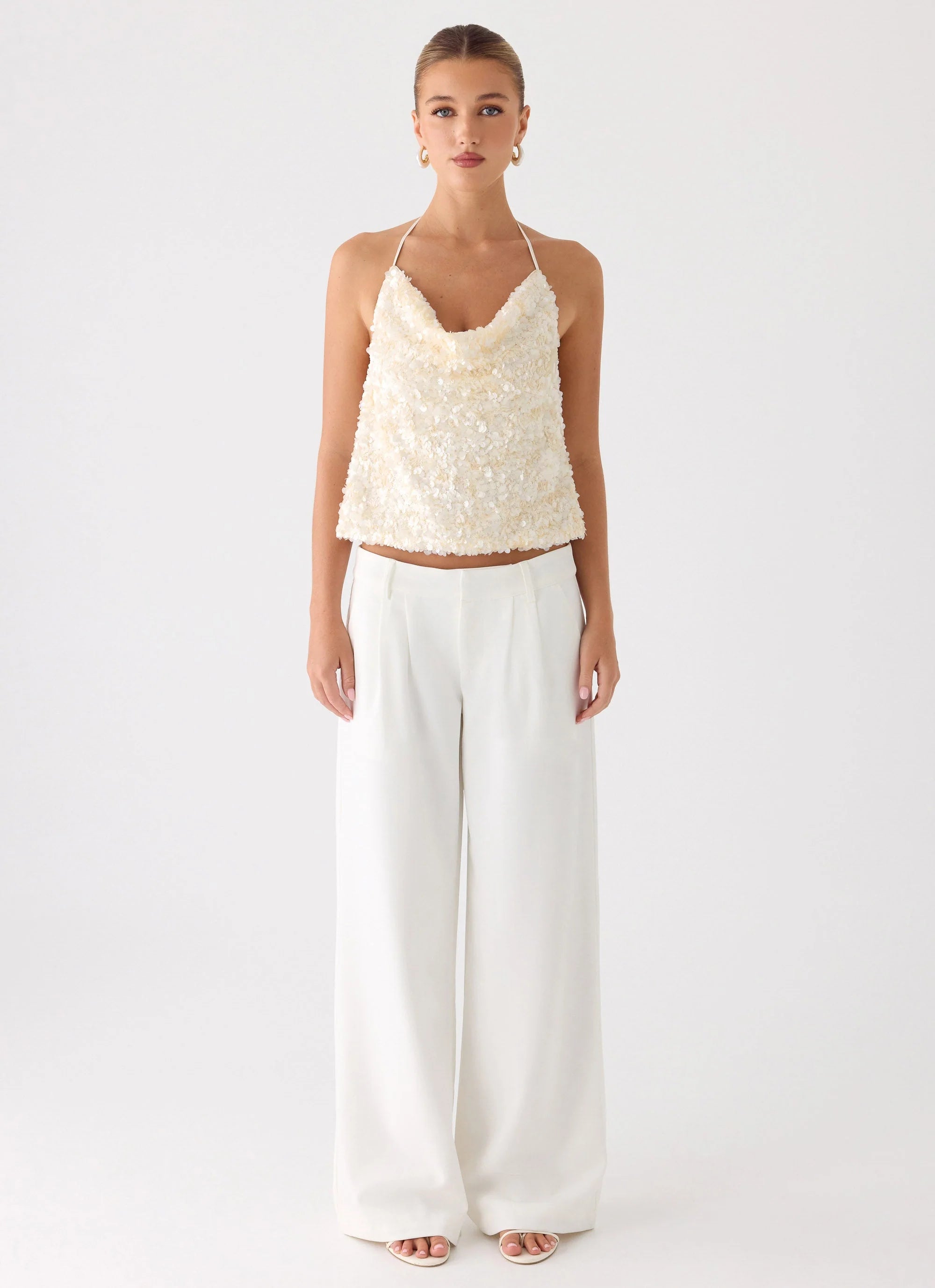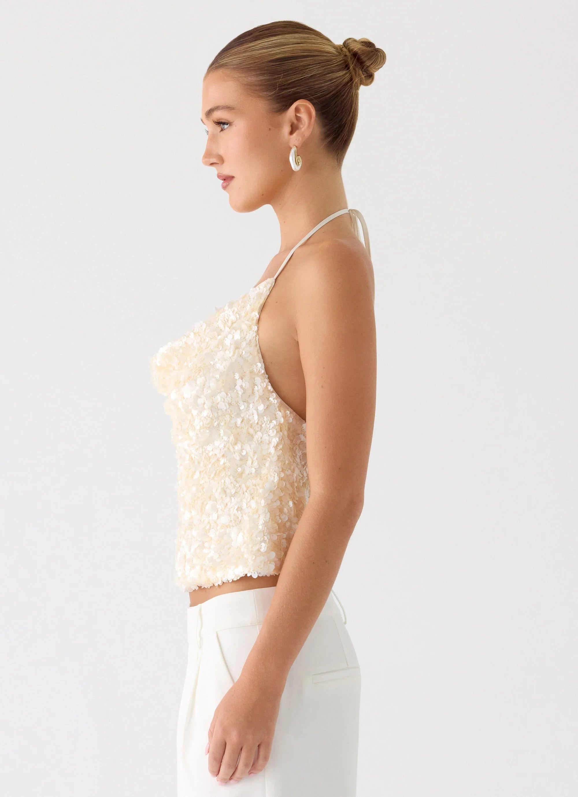 The Amelita Sequin Top is a glamorous halter-neck piece, adorned with sequins and featuring a soft cowl neckline. Fully lined for comfort, it has a low back for a bold, elegant look perfect for evening occasions.