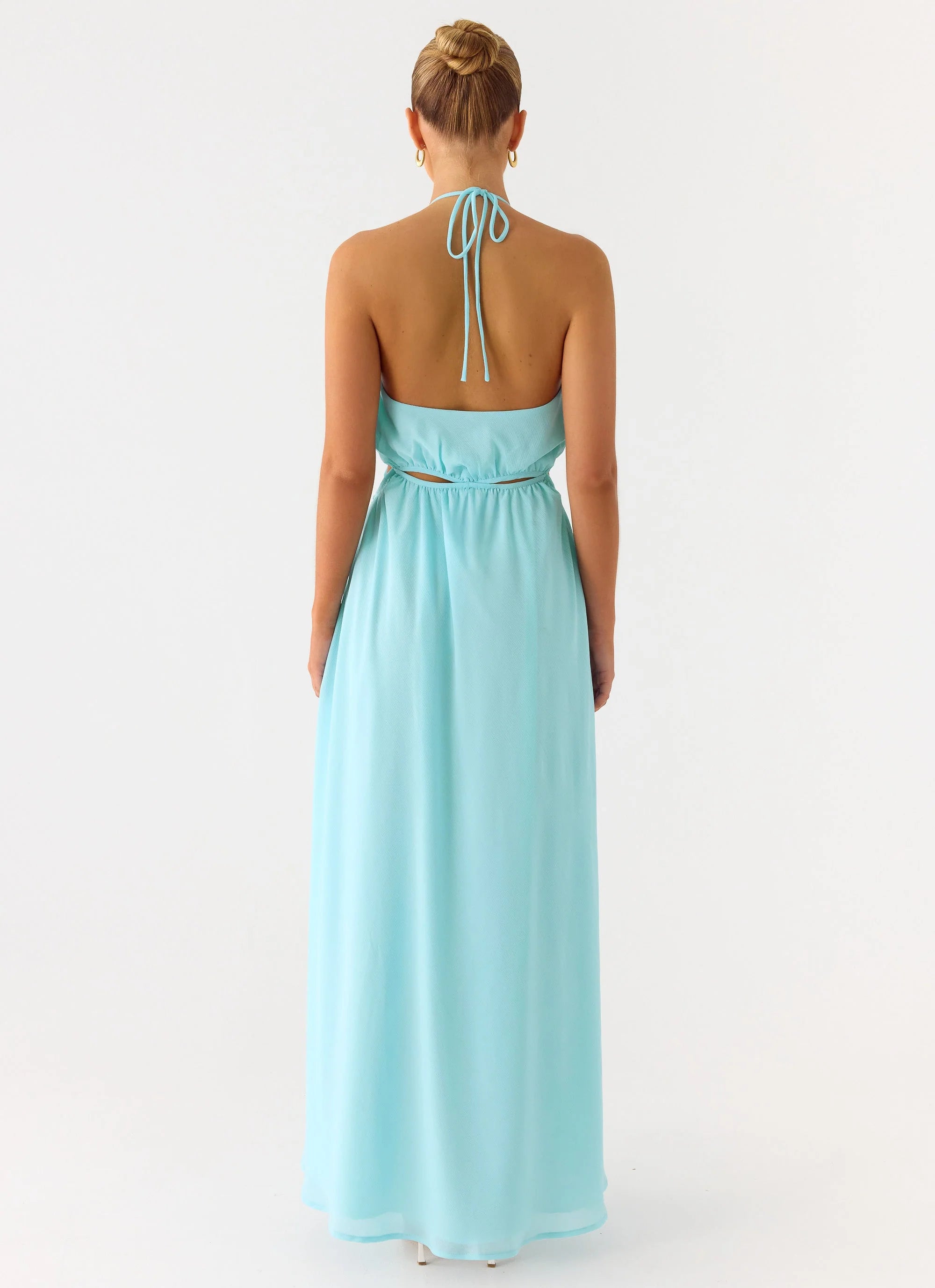 The Ardenzelle Chiffon Halter Neck Maxi Dress is a statement-making maxi with delicate detailing. Featuring a halter neckline with thin adjustable straps, a front waist cutout, and front stone detailing, this fully lined dress exudes elegance. A side invisible zipper ensures a seamless fit.