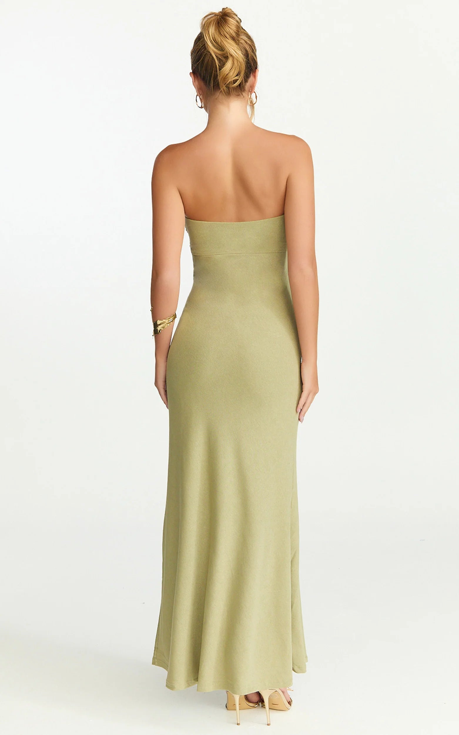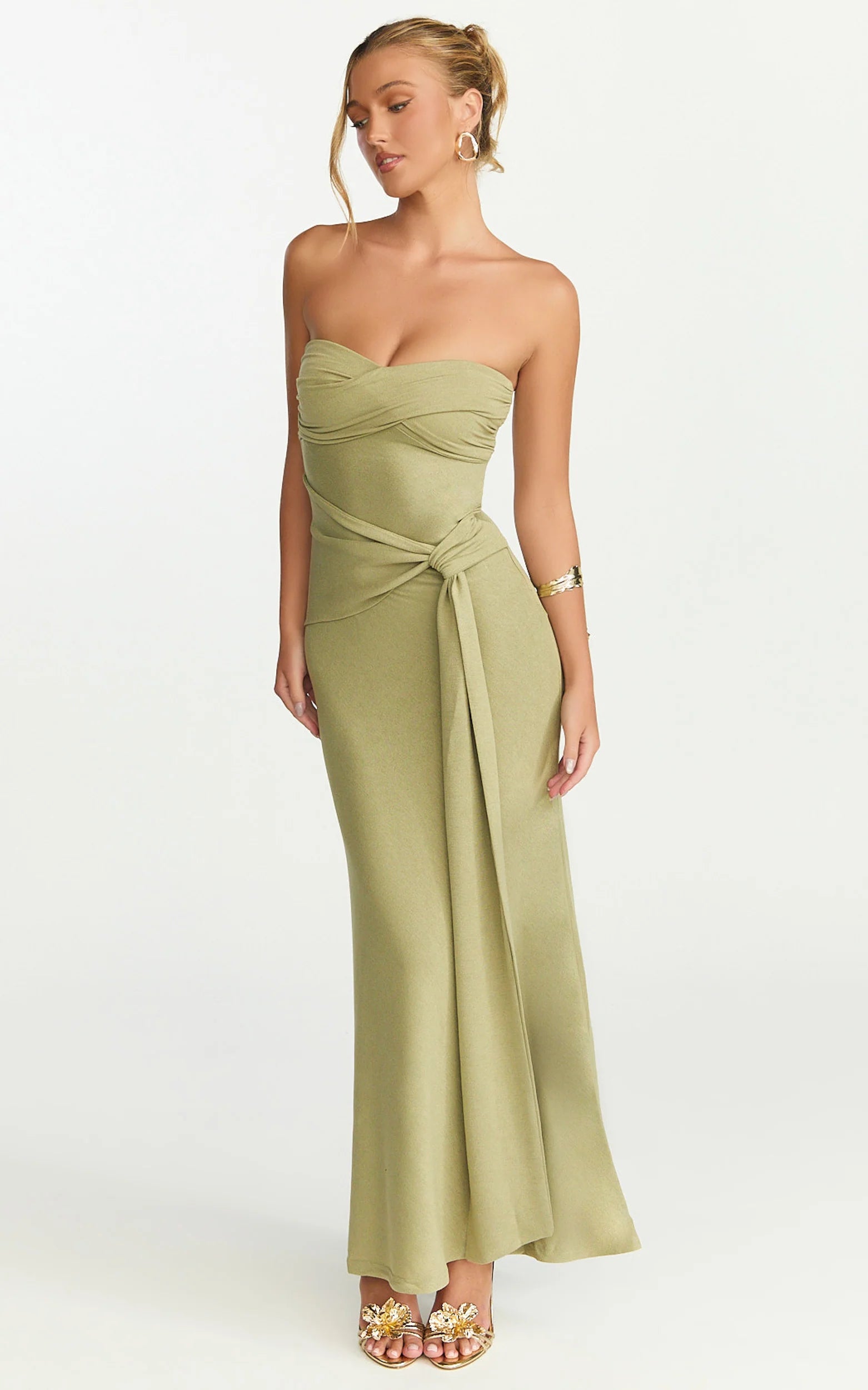 This strapless maxi features a flattering tie waist and sleek silhouette that skims and elongates, perfect for parties, date nights and every RSVP in between. The soft sage hue adds an elevated touch while the clean lines keep it fresh and easy to wear.