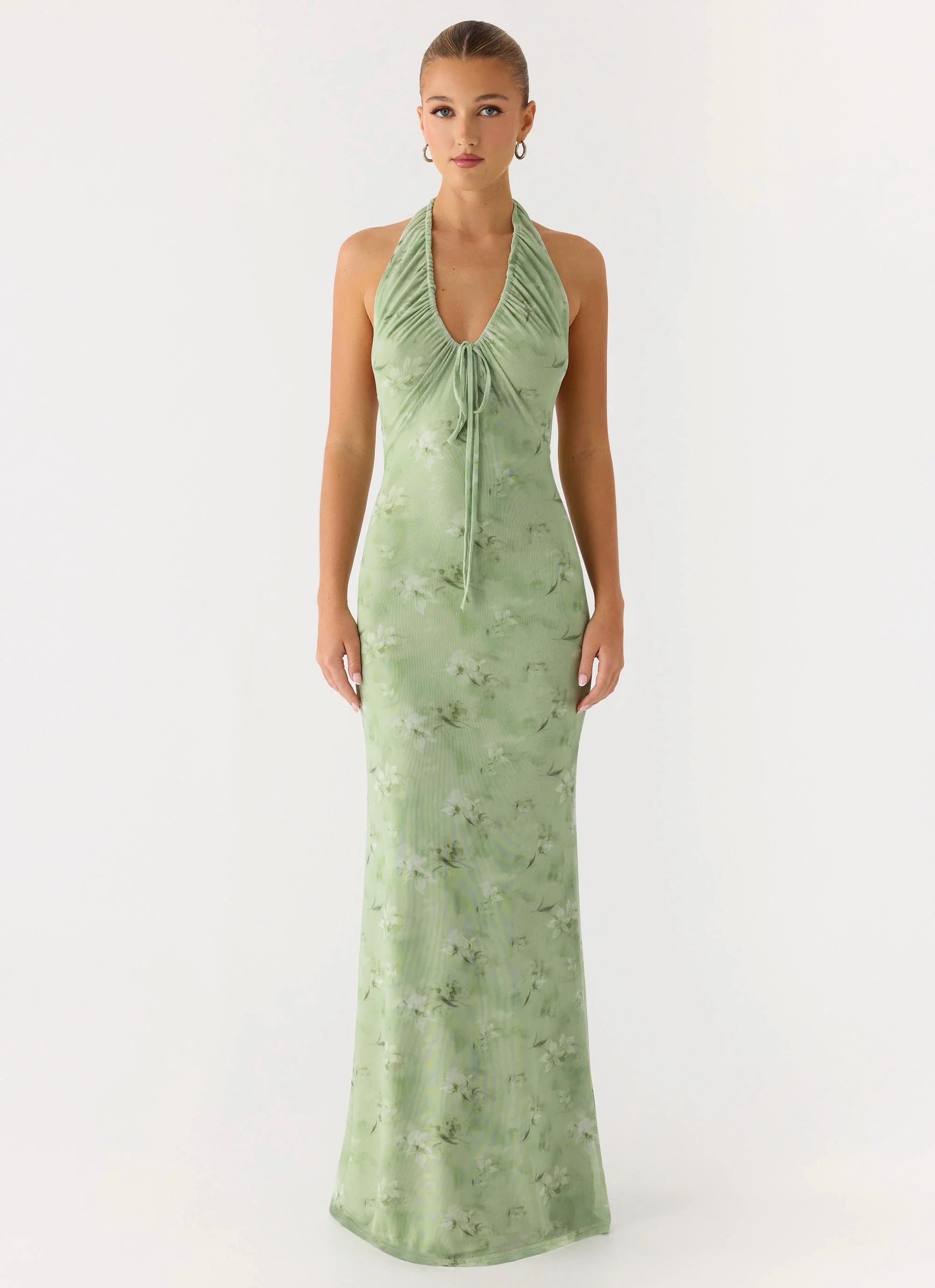 The Ask You Twice Maxi Dress is made for sun-soaked days and warm evening soirees. Featuring a V-neckline with ruched detail, front tie, and halter neck, its body-hugging maxi-length silhouette flatters the figure while offering effortless movement.