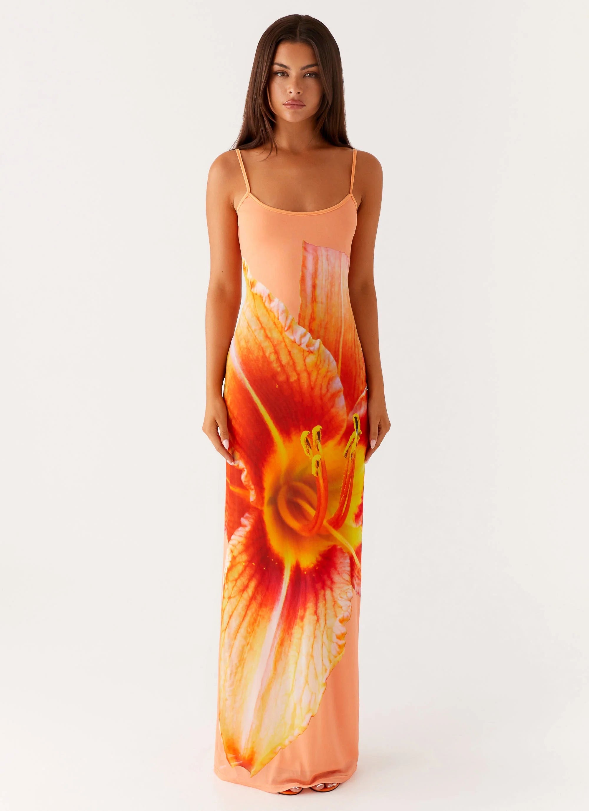 A statement in semi-sheer mesh, this printed maxi features a rounded neckline, adjustable straps, and a body-hugging fit. Binded detailing and self-lining provide comfort with a sultry, elevated edge.
