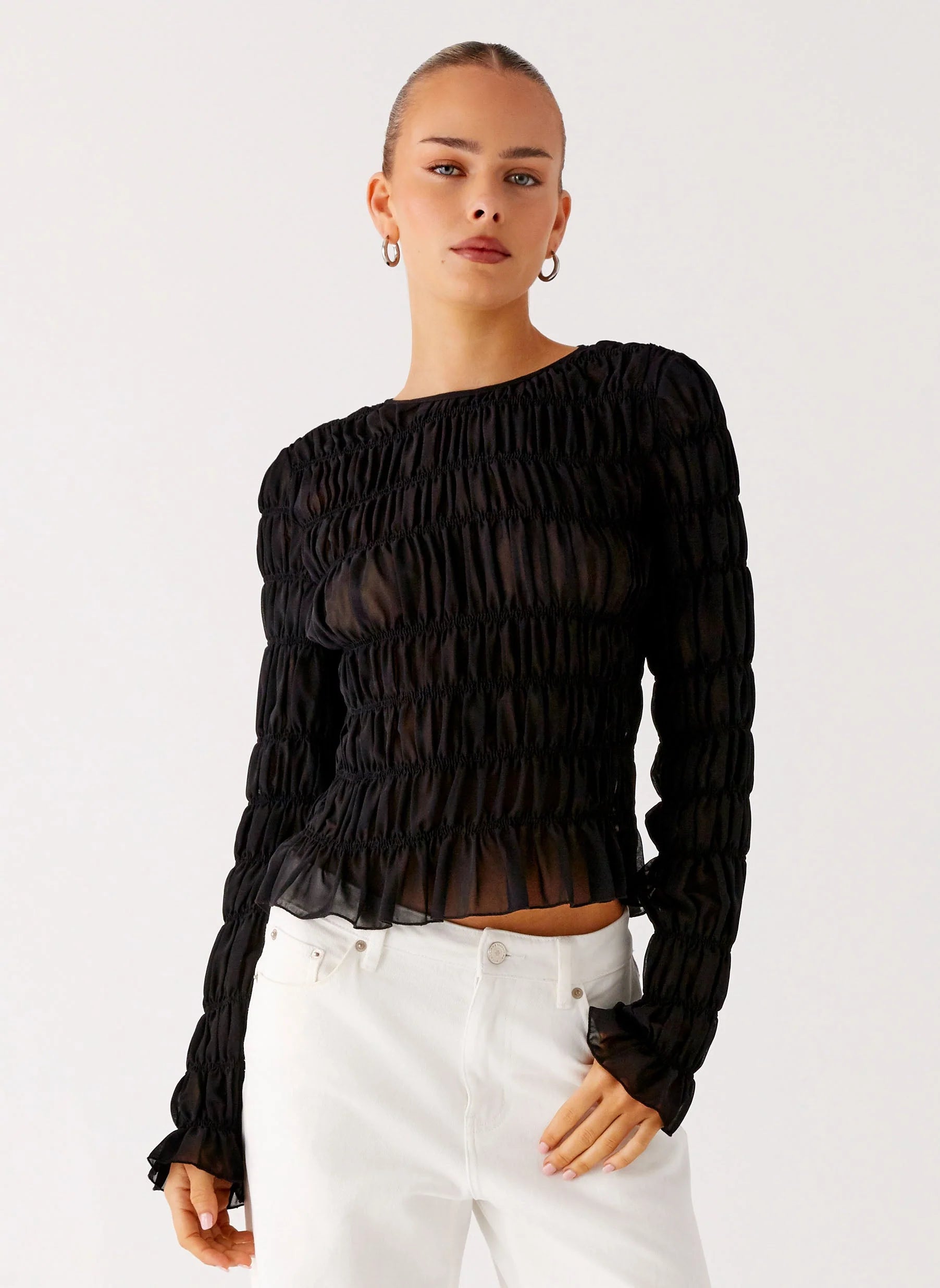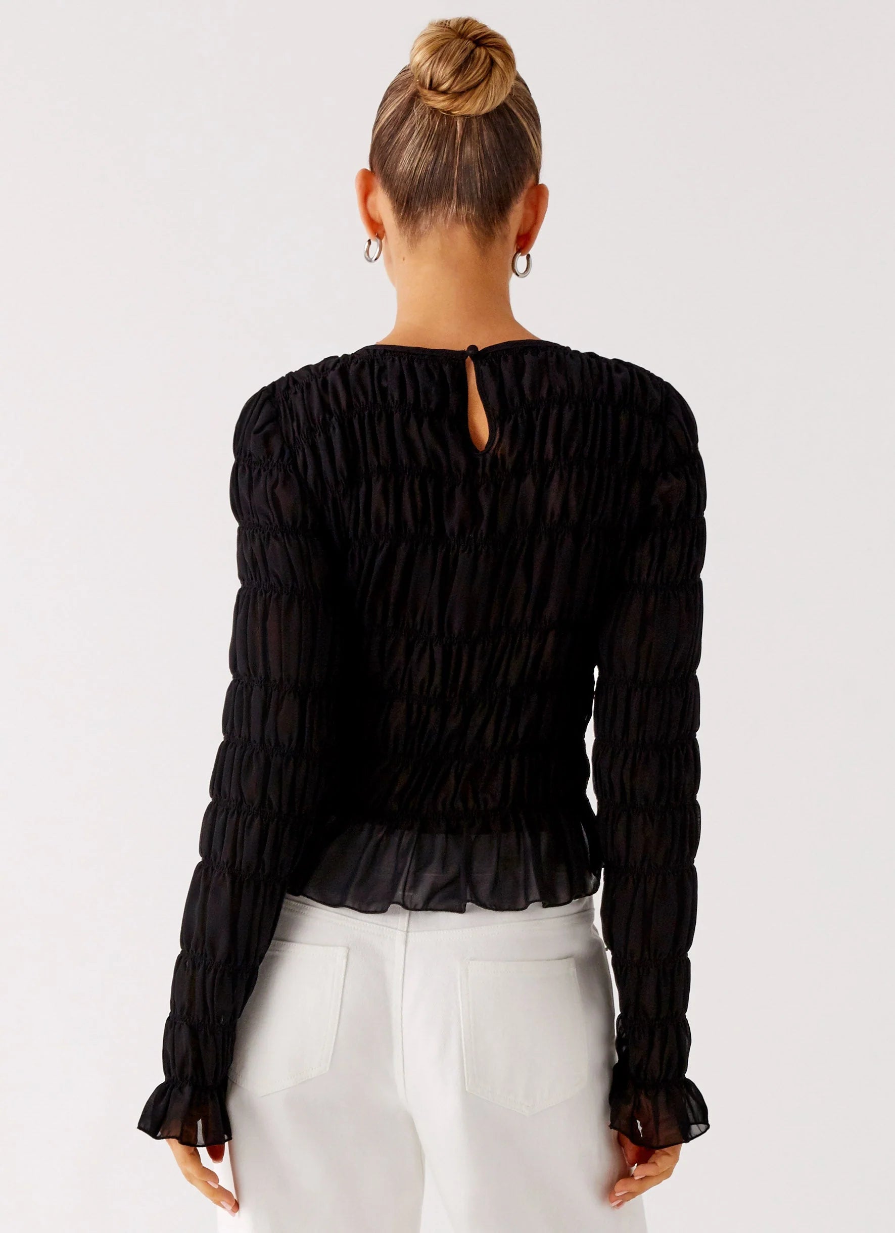 The Bella Long Sleeve Top is made for those golden nights that never fade. Featuring a high scoop neckline and sheer fabric with shirred detailing on the body and sleeves, this fitted top is unlined and finished with a delicate button and loop closure at the back neckline window.