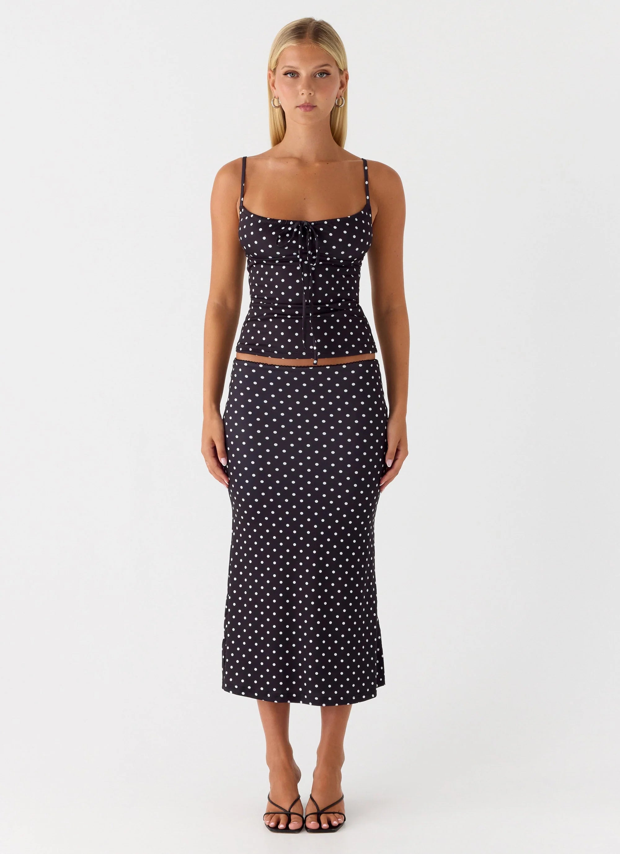 The Bending My Rules Top is a flattering and feminine style featuring a scoop neckline and adjustable thin straps. Designed in an exclusive polka dot print with a front drawstring detail, this stretch top offers a perfect balance of comfort and effortless style.