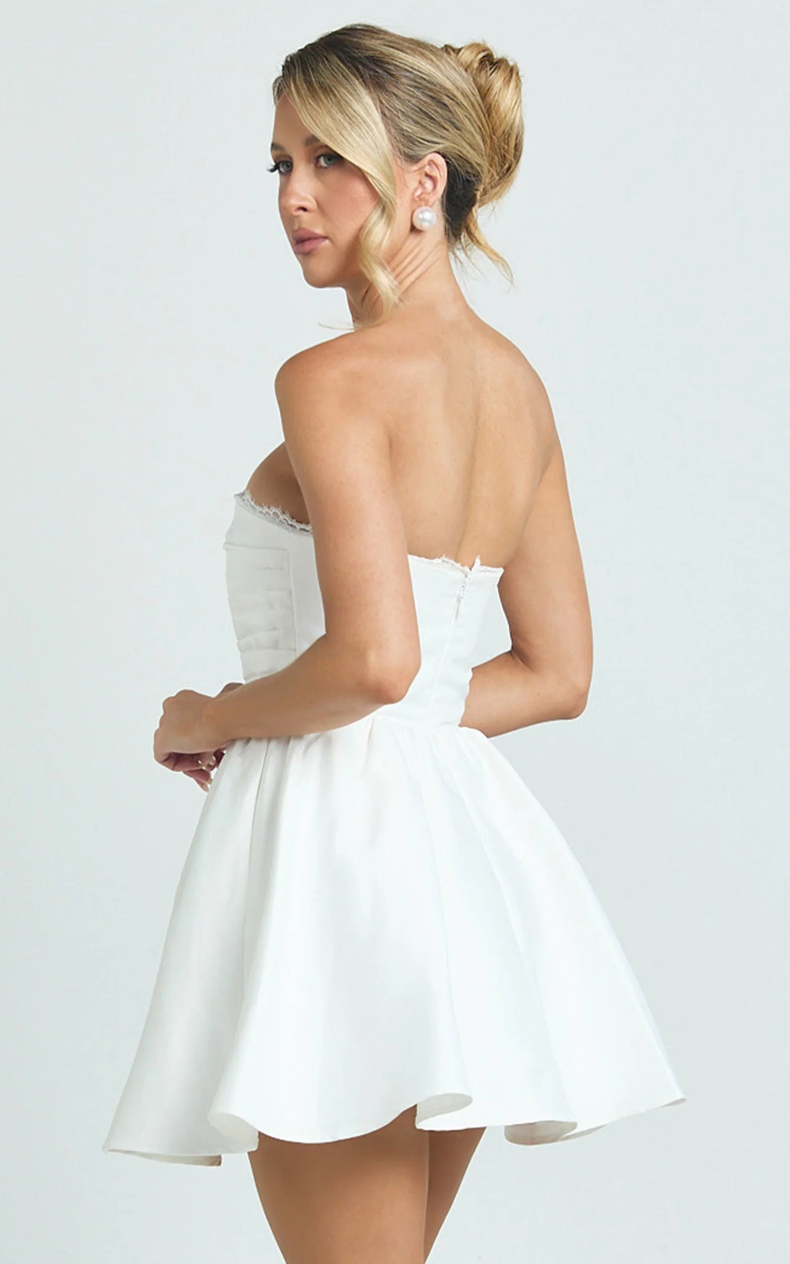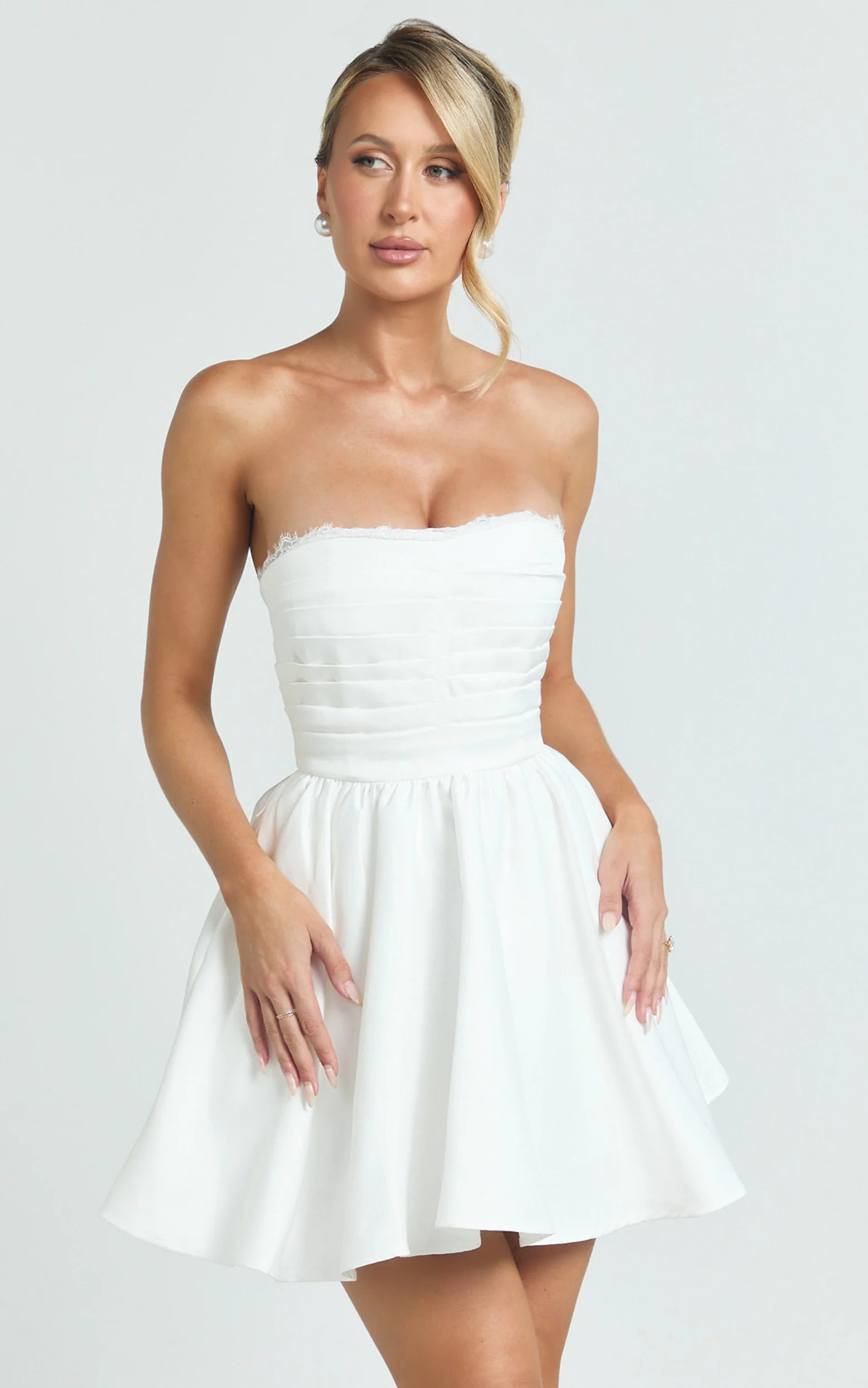 Bianca Mini Dress - Strapless Fit And Flare Dress In Ivory frames the neckline beautifully and highlights your shoulders, while the mini length keeps it flirty without trying. It’s one of those dresses you reach for when you want simple, polished, and seriously cute.