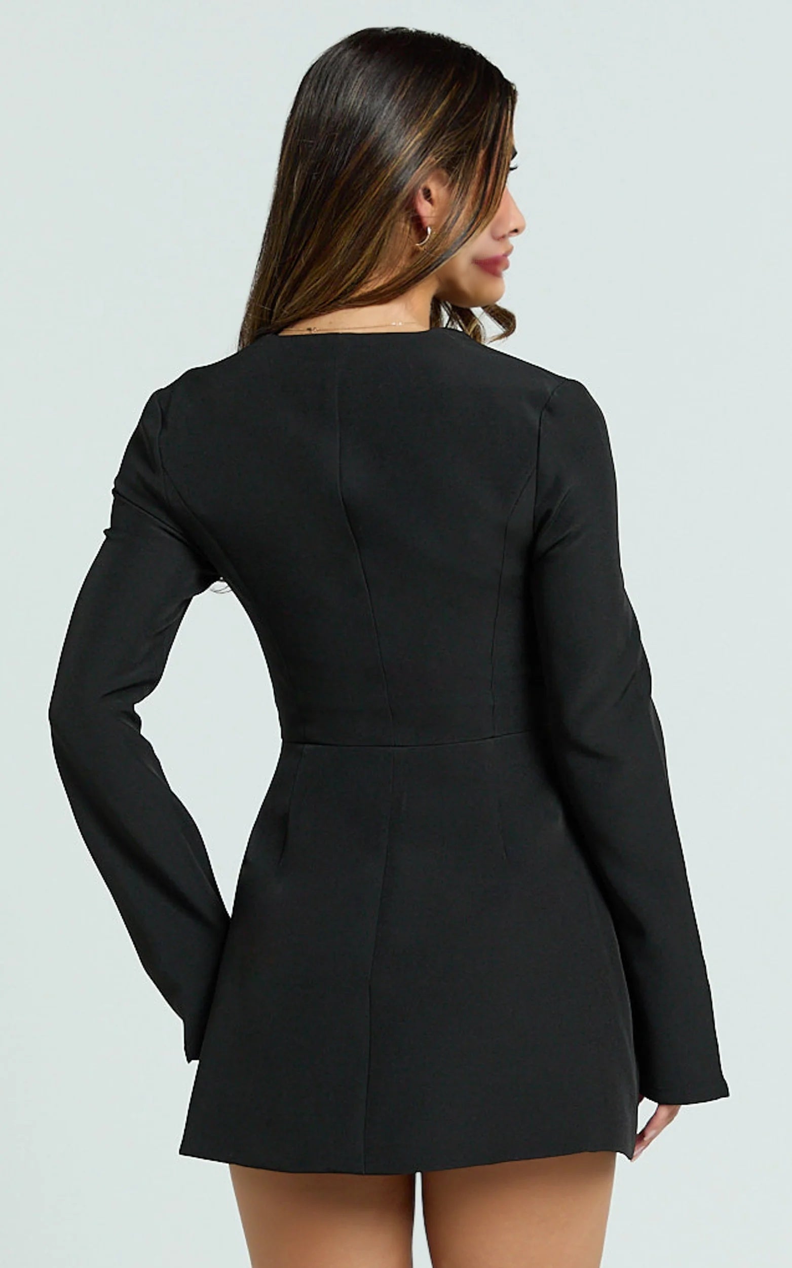 This long-sleeved mini dress has a sweetheart neckline, a zip-front design, and a tulip hem that nicely frames your legs. It gives a sleek and confident look, perfect for the spotlight. The black color offers a monochrome charm, and the clean lines bring a minimalist feel. It's an ideal choice for nights out, dates, or last-minute events.