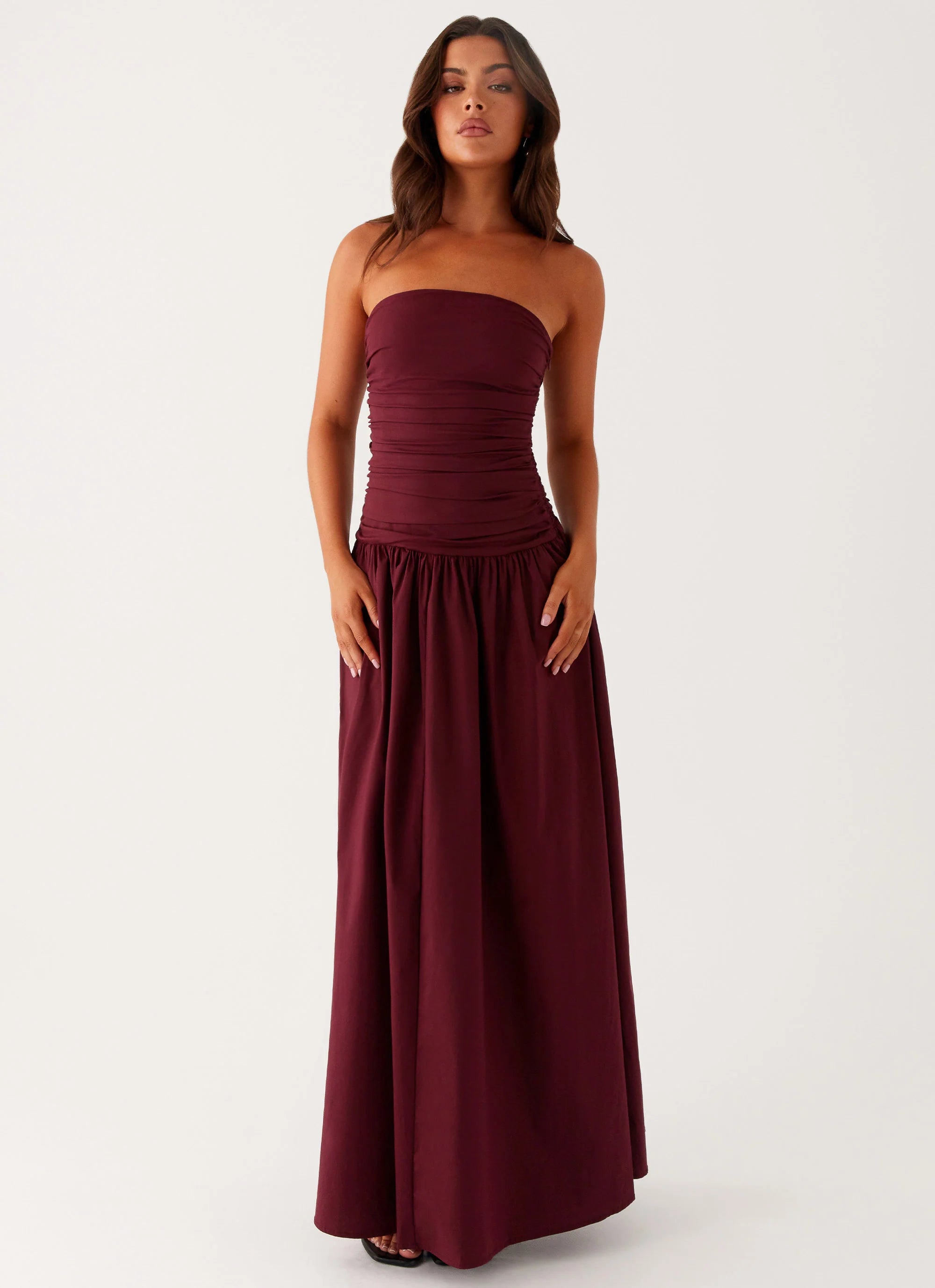 The Carmel Maxi Dress exudes effortless elegance. Featuring ruched sides that flatter your curves, a drop waist for a relaxed silhouette, and a strapless neckline, it’s made for those unforgettable moments.