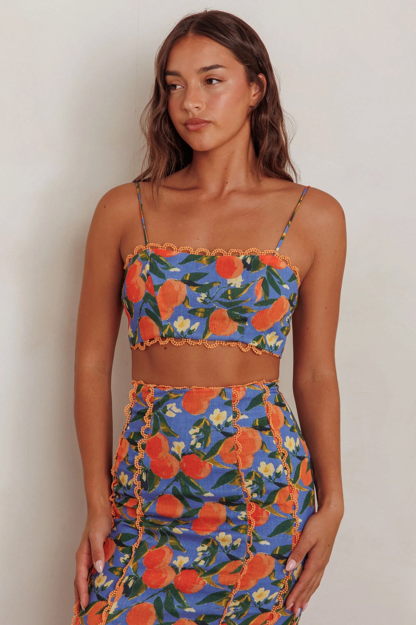 Breeze through the weekend in our chic Chamberlain crop top. We are obsessed with its scalloped lace trim and tied back. Perfect for champagne brunch with your girls, teamed with its matching skirt, kitten heels, and a saddle bag for a sophisticated look that will turn heads.