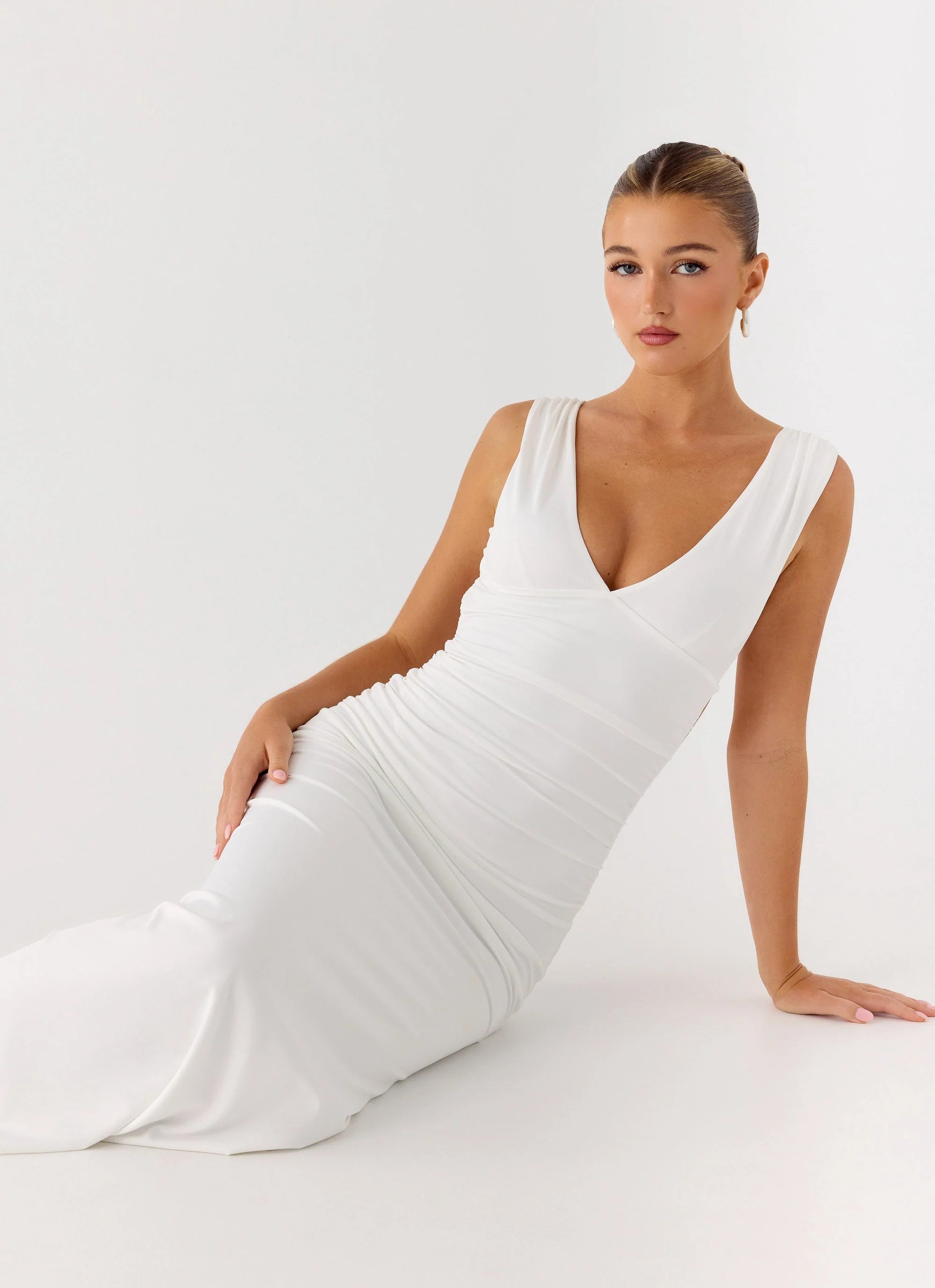Make an entrance in the Cherry Sky Maxi Dress — a sleek and sultry silhouette made for special nights. Featuring a flattering v neckline, ruched sides, and a statement back cut out with a low back finish. Crafted from stretch jersey for a figure-hugging fit and self-lined for comfort.
