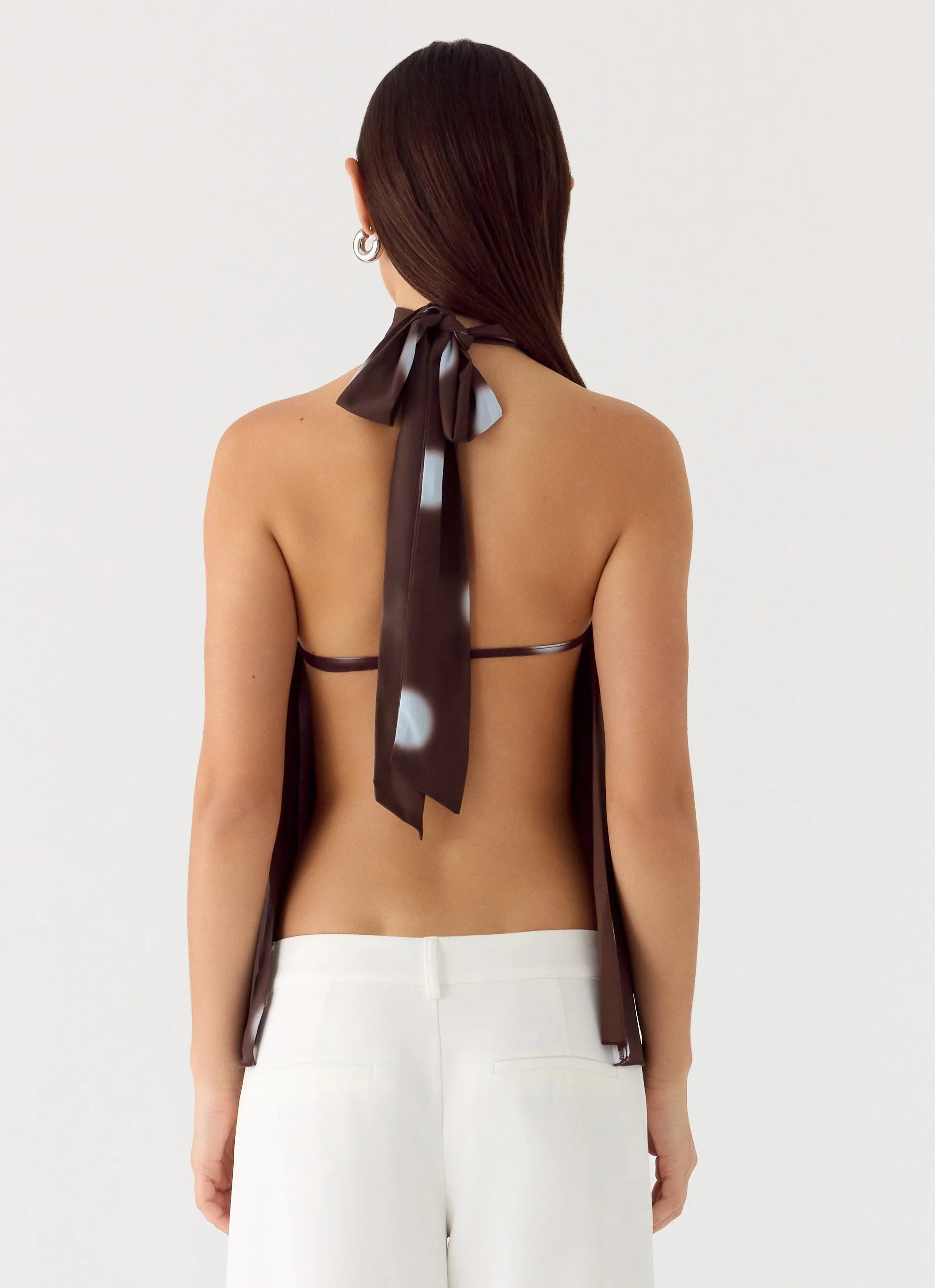 The Corrida Backless Top is made for nights that shimmer from sunset into late hours. Featuring a halter neck with scarf detailing and back elasticated ruching, it creates a flattering, feminine silhouette. Crafted in lightweight chiffon with a fully lined finish, the exclusive print adds a playful, editorial touch to every look.
