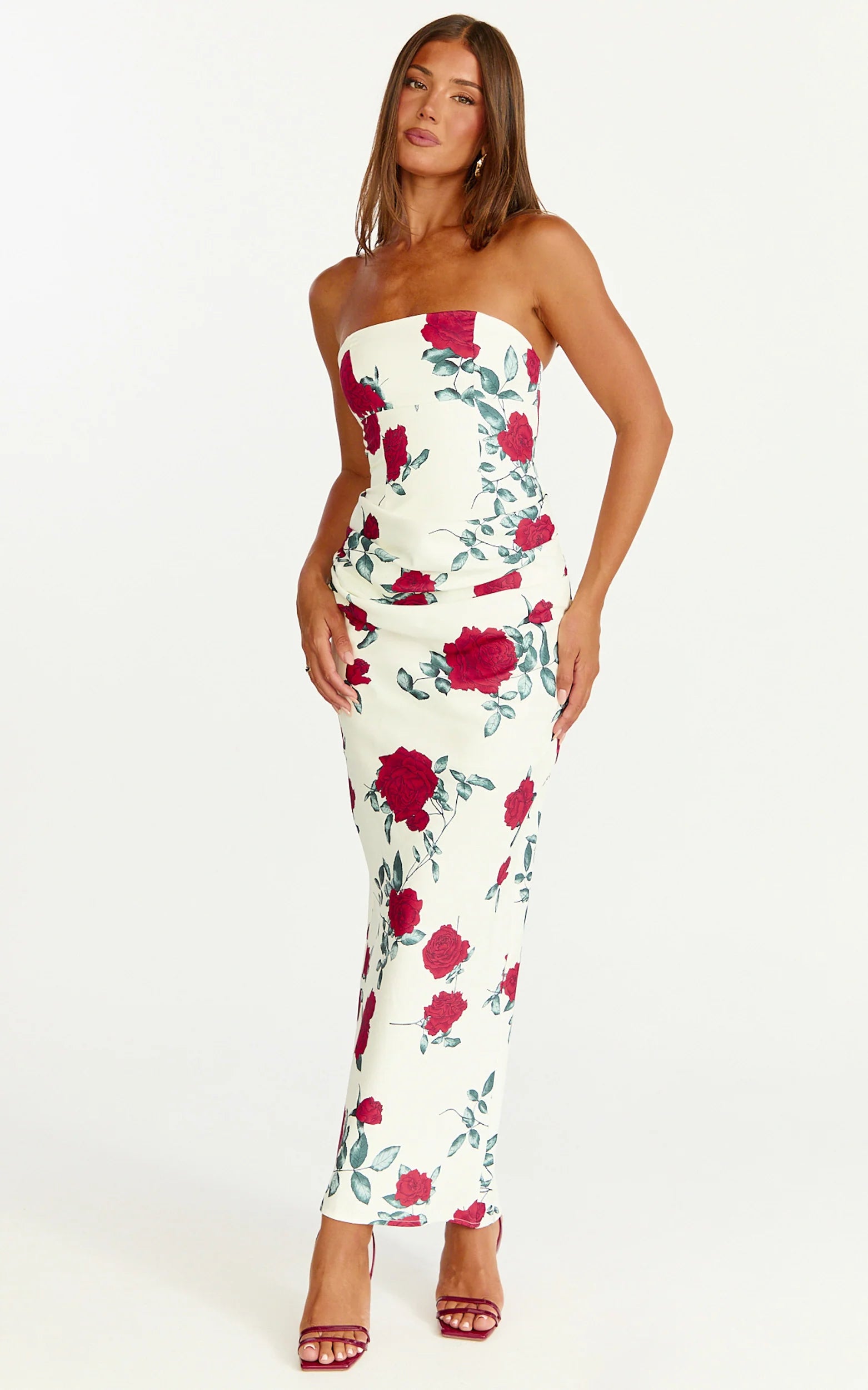 A draped cowl at the waist sculpts your shape, while the fitted silhouette and midi hem create a sleek, confident finish in a bold scarlet rose print. It’s the piece you reach for when the invite says “dress to impress” and you want zero stress.