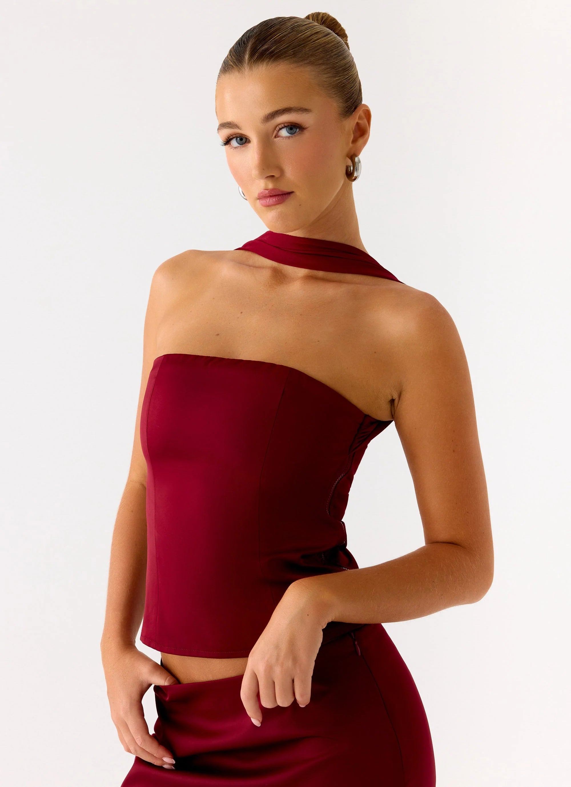 The Do It Again Top is a strapless corset-style piece with scarf detailing, fully lined for comfort and structure, finished with a side invisible zipper.