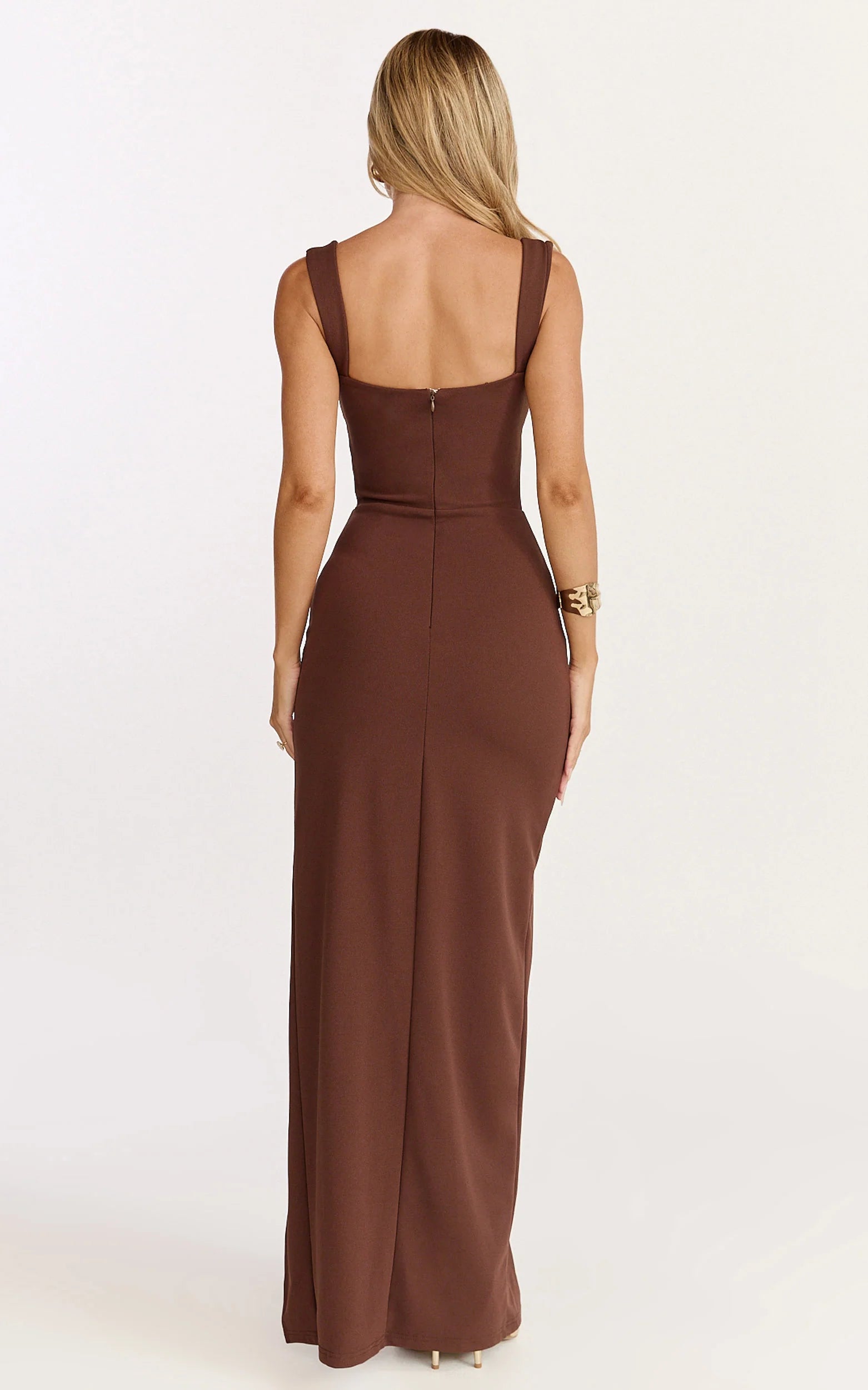 A sleek column silhouette, sultry cowl neckline and thigh-high split bring just the right amount of drama, while the rich brown hue adds luxe depth that suits every skin tone. It’s the kind of piece that fits, flatters and lets you own the room, no fuss, all confidence.