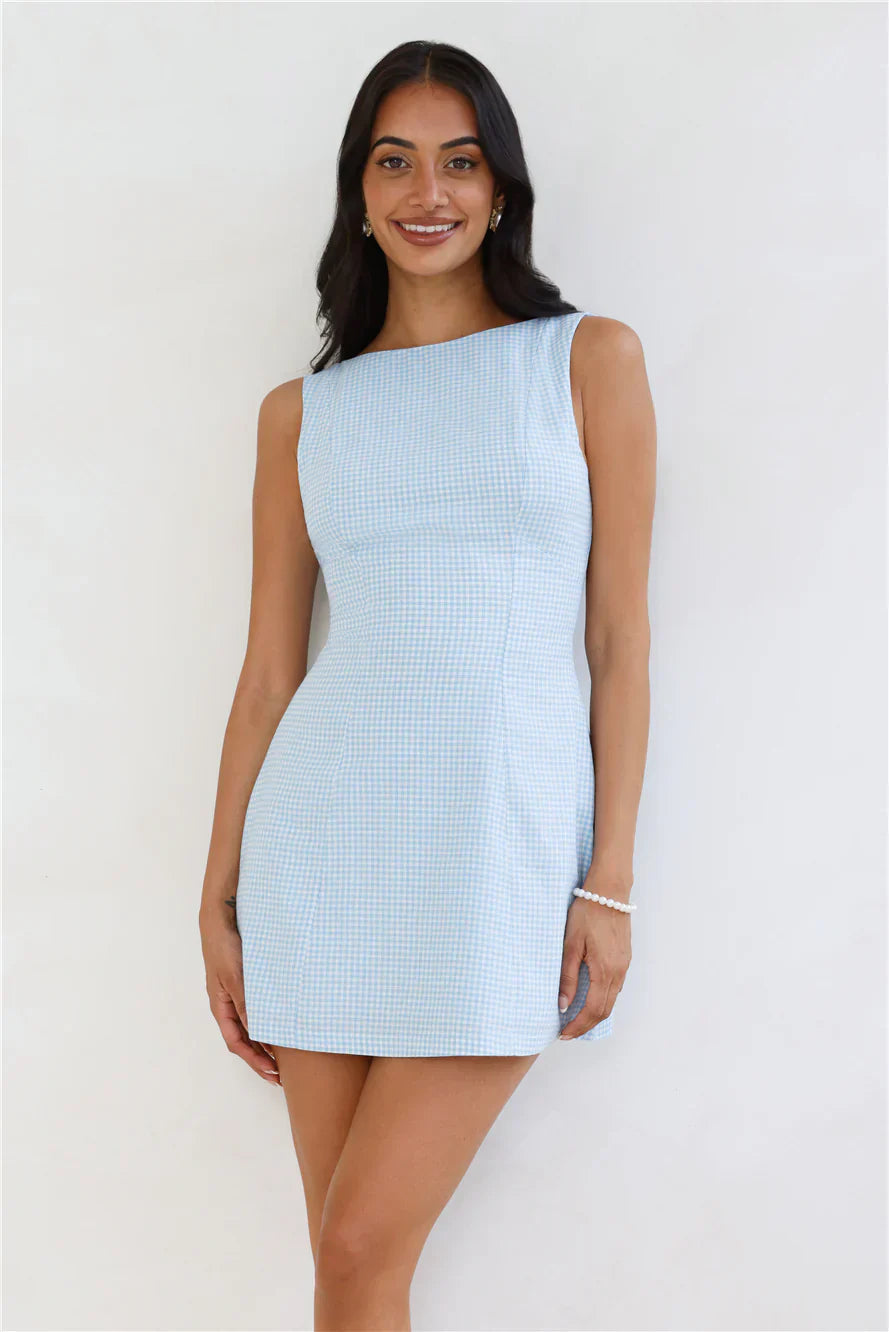 We're in love with this silhouette. Be seen in the Dream Paddock Gingham Mini Dress, which features a high neckline, a V-back, and an A-line fit. Style with heels for your new fave 'fit.