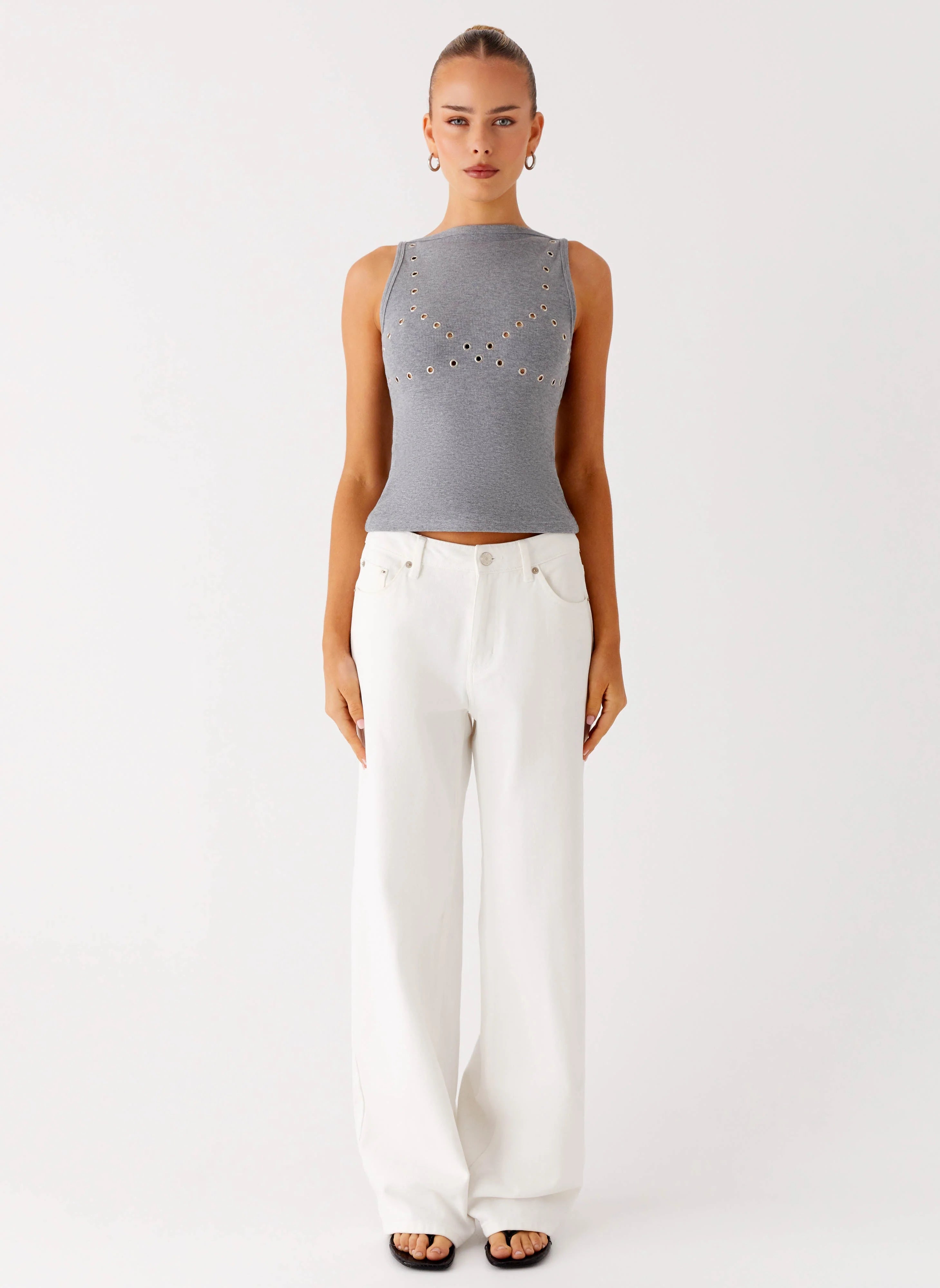 The Drop Top Ribbed Eyelet Tank Top is your effortless daytime essential with a hint of edge. Featuring a boat neckline and delicate front eyelet embellishments, this fitted tank is crafted from a soft cotton blend for comfort and style that carries from sunlit afternoons to balmy nights.