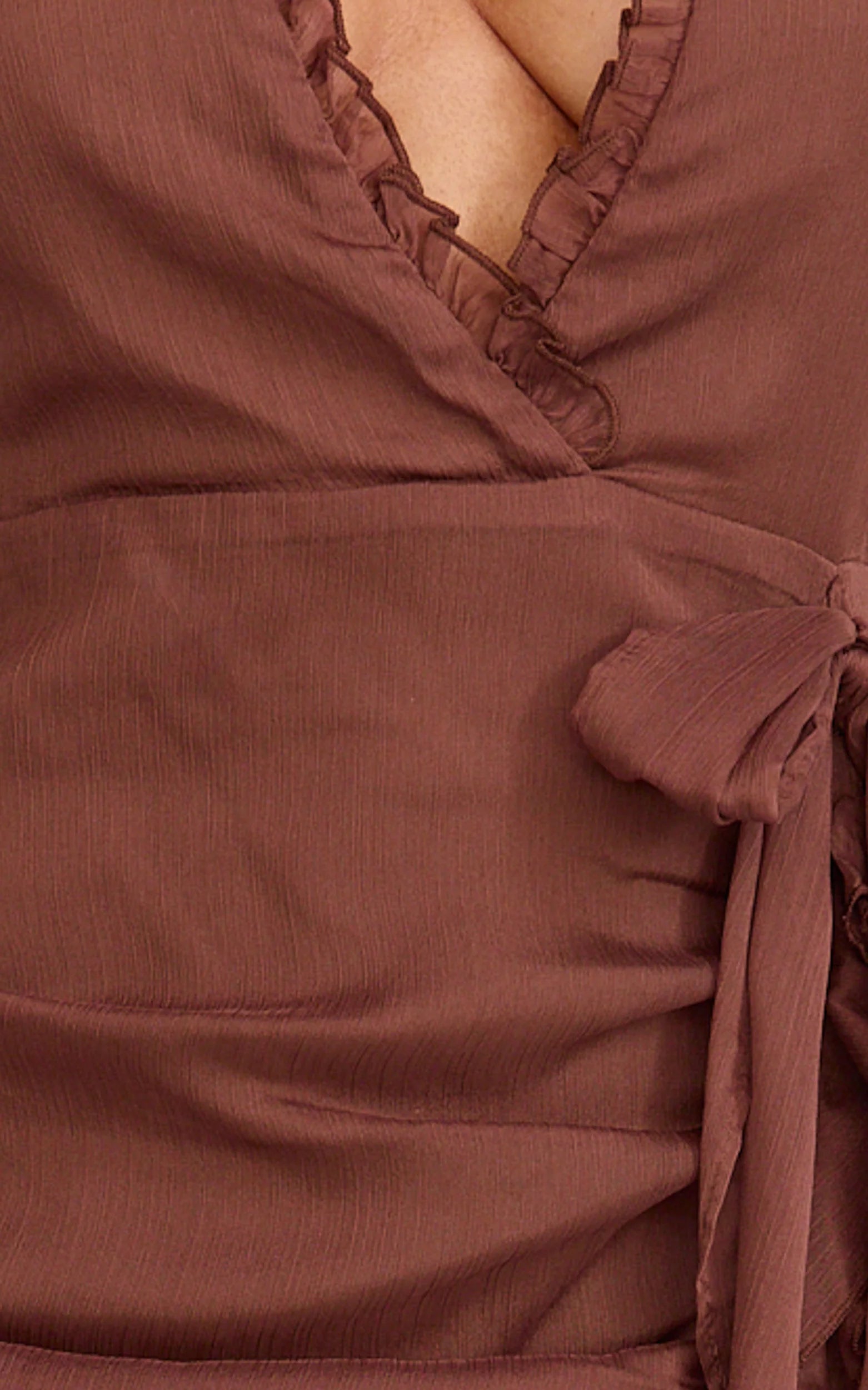 The Eleonor Maxi Dress is your go-to for weddings, long lunches and dance floors, confident, flirty and ready for compliments. The rich brown hue pairs beautifully with warm-toned accessories, while the ruffle detailing adds soft drama without trying too hard.