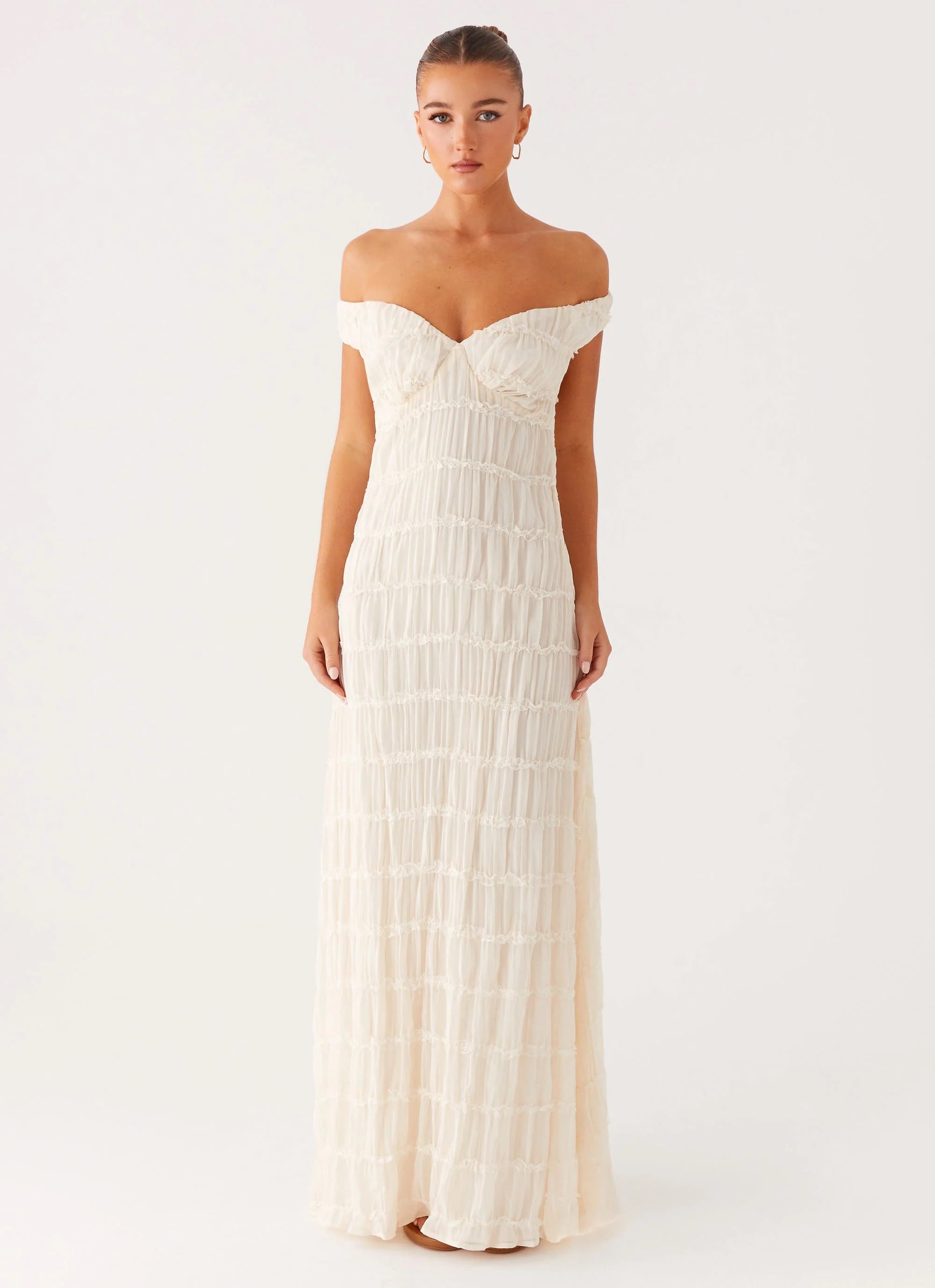 A romantic off-shoulder maxi dress crafted from textured fabric. Featuring an elasticated back strap for comfort and a fully lined silhouette for a seamless finish.