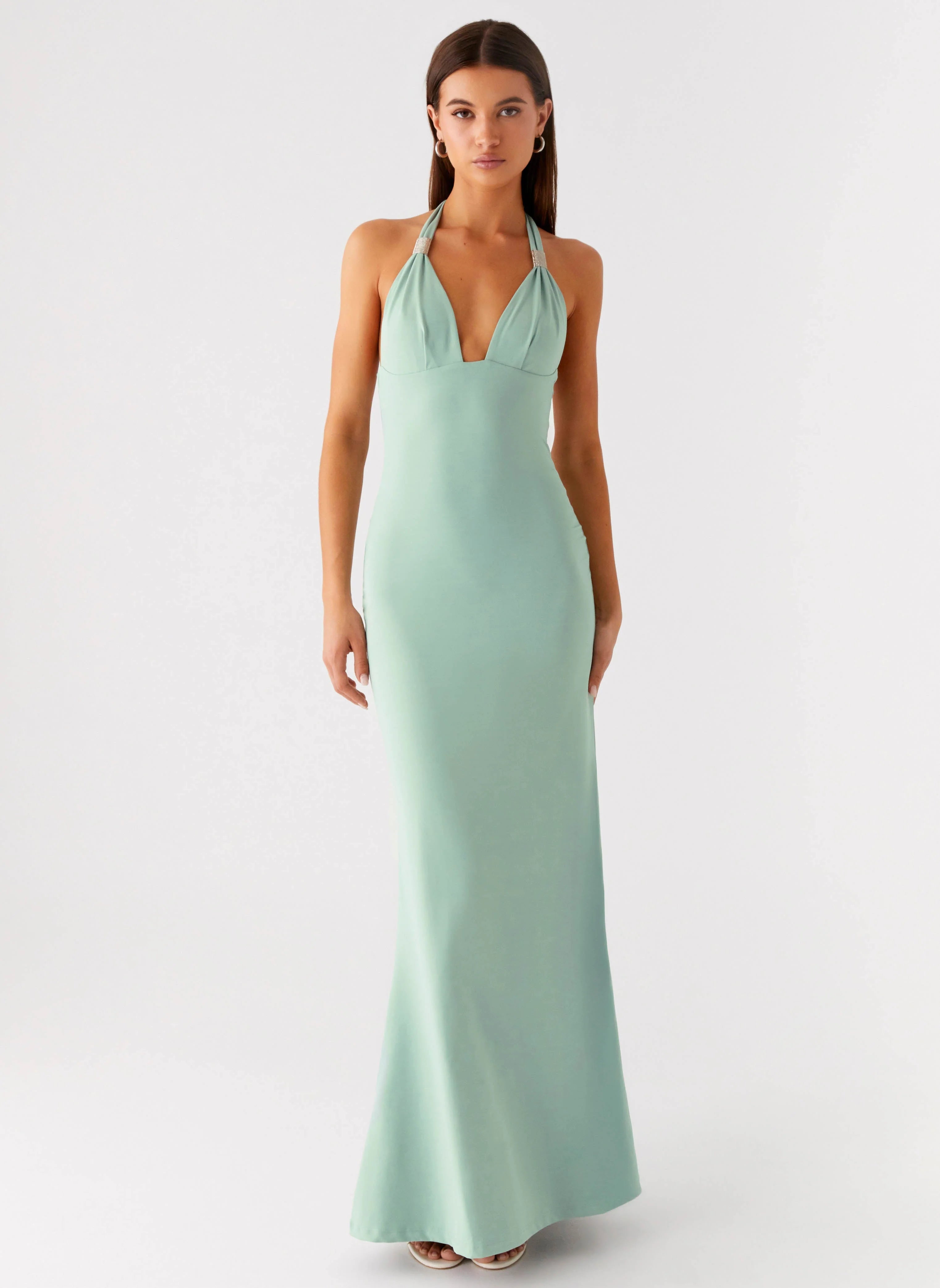 The Fern Valley Maxi Dress is made to dazzle from dusk till dawn. Featuring a halter neckline with a gold metal embellishment and a low back with a thick strap, this bodycon stretch jersey dress hugs every curve for a sleek silhouette. Its maxi length and luxe details make it your perfect pick for nights that glow.