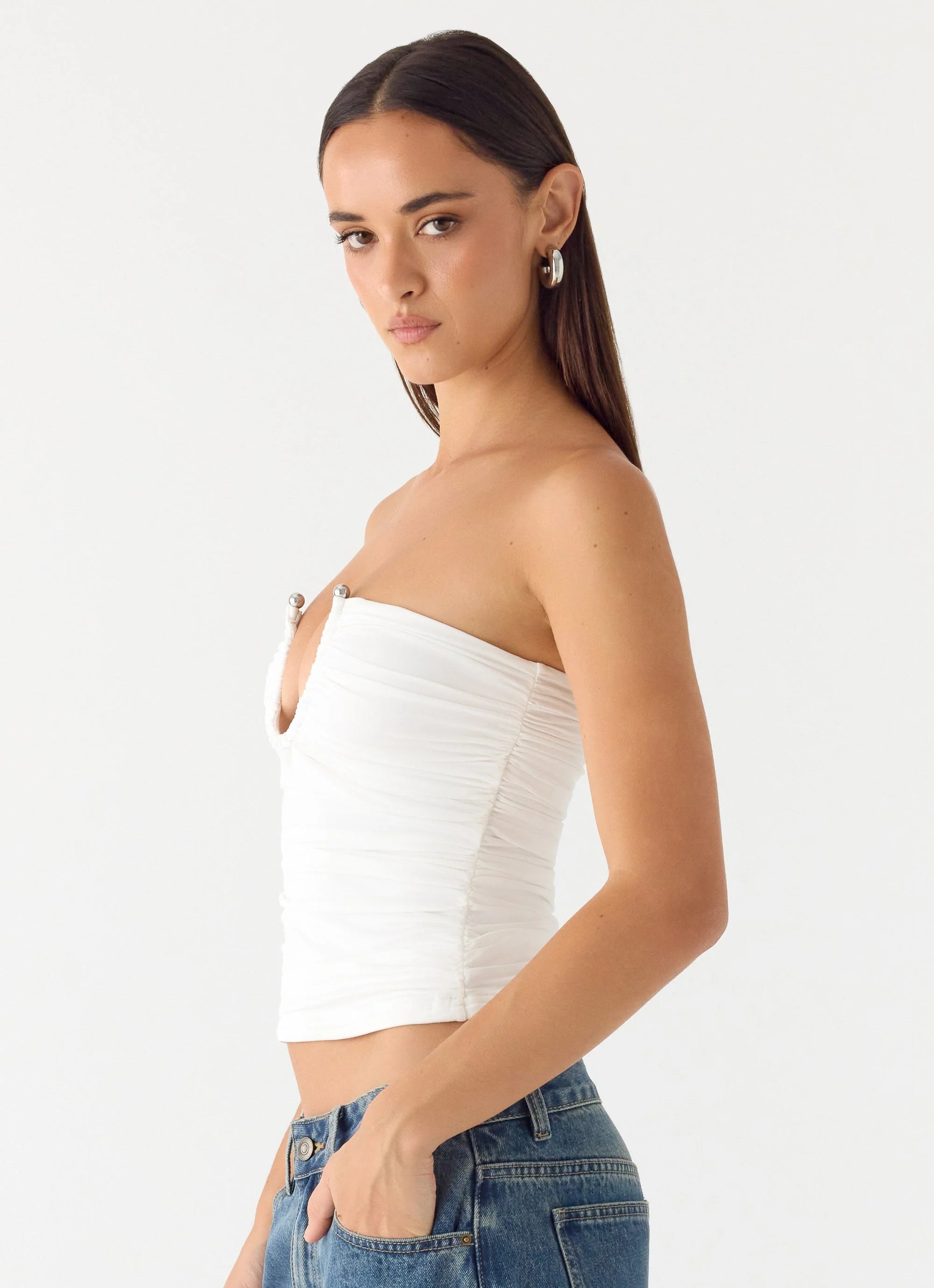 The Francis Top is made for evenings that transition effortlessly from golden hour to after-dark moments. Featuring a strapless deep plunge neckline and stretch jersey fabrication, this crop-length style hugs the body with confidence and ease. Front metal hardware adds an editorial edge, making it perfect for warm nights and playful escapes.