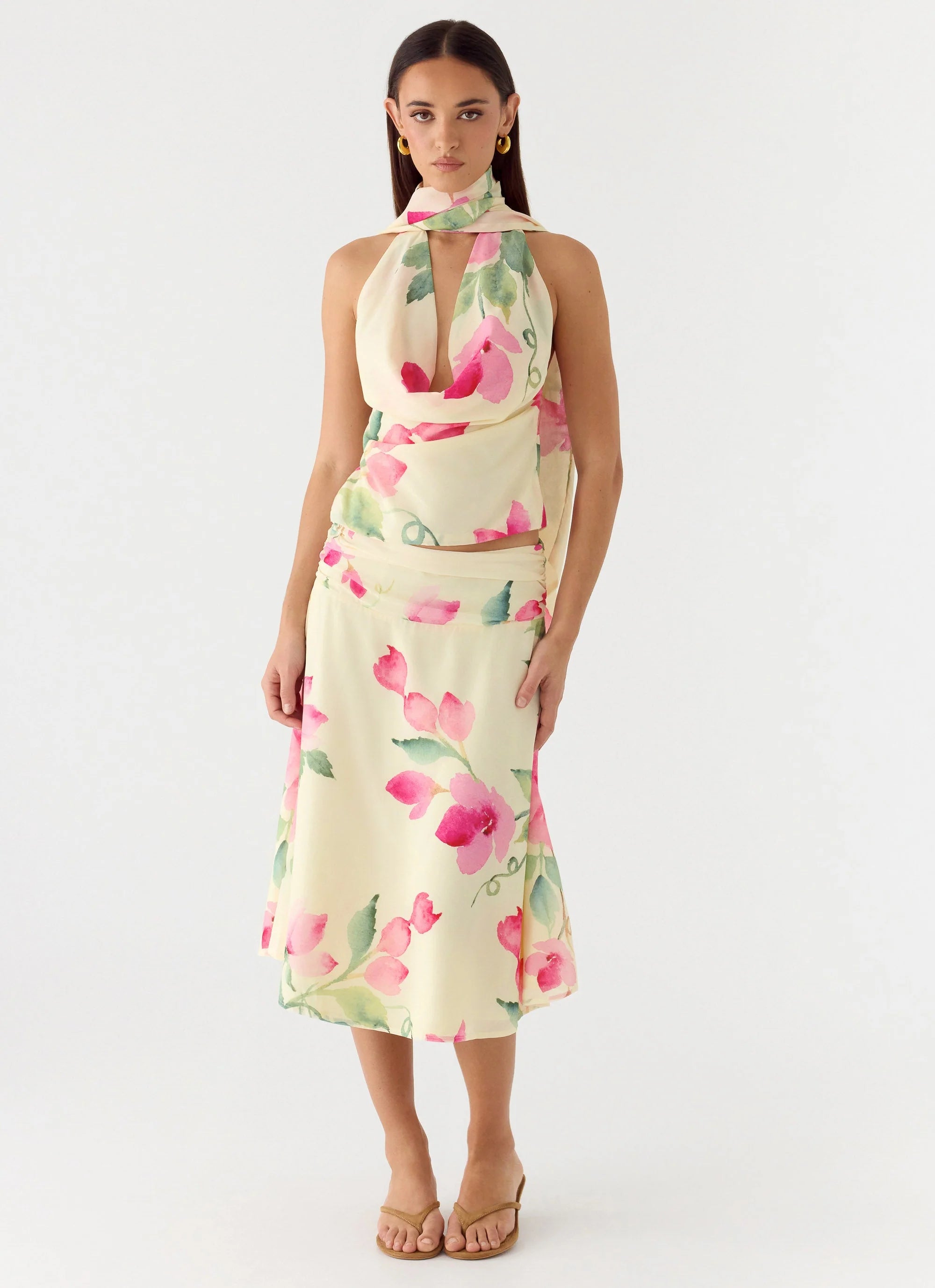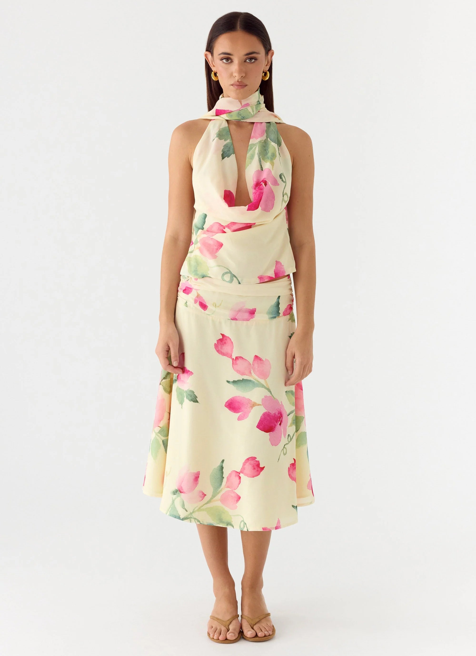 The Get Me Halter Backless Top is made for nights that glow long after sunset. Featuring a low cowl neckline with fluid scarf detailing, this statement silhouette is designed to be worn multiple ways for an effortlessly confident look. Finished with a backless shape and button detailing.