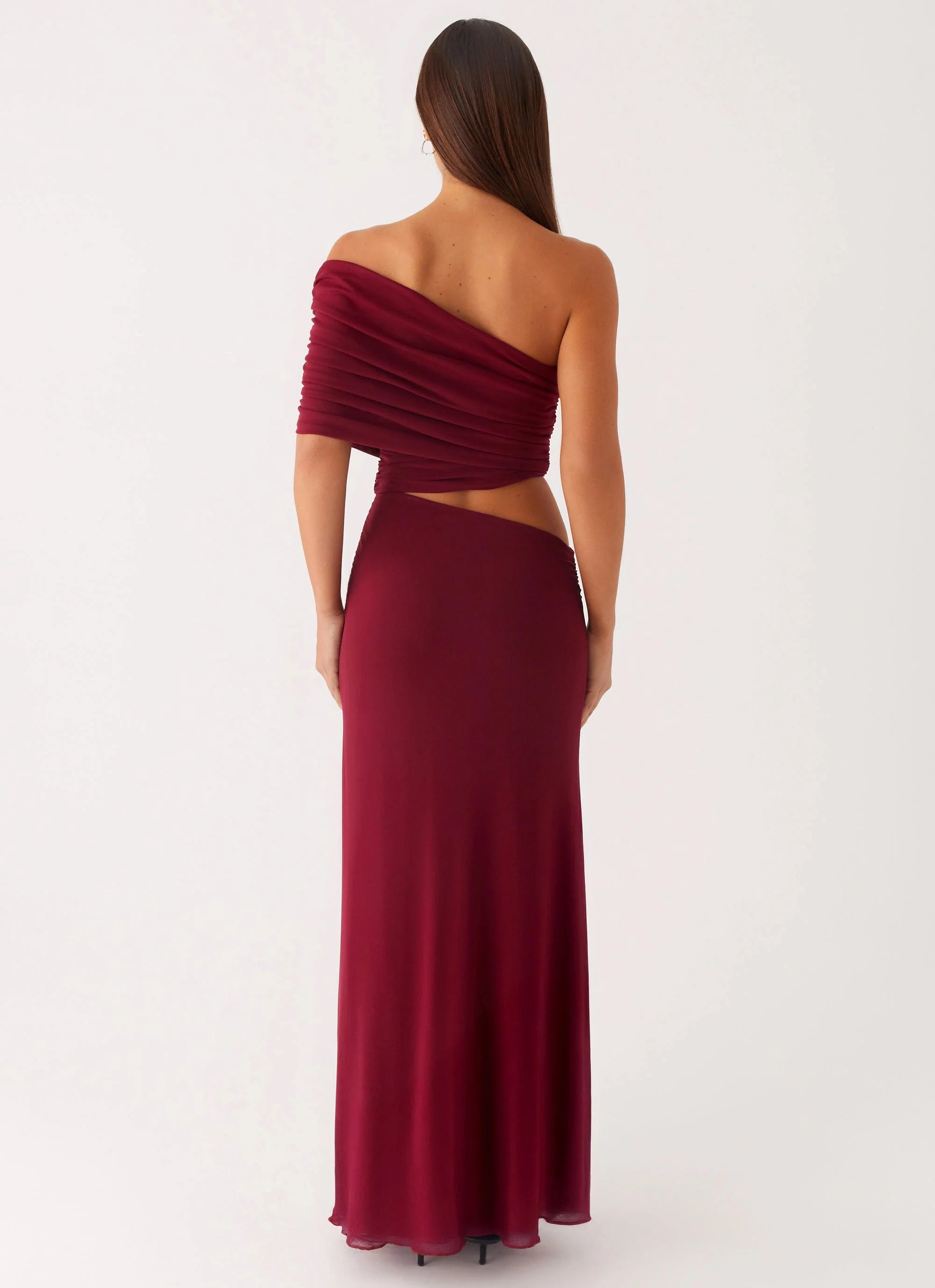 The Gillian Maxi Dress is sleek and striking, designed to turn heads. Featuring a one-shoulder neckline and a daring lower stomach hip cutout, it blends bold details with a sophisticated silhouette.