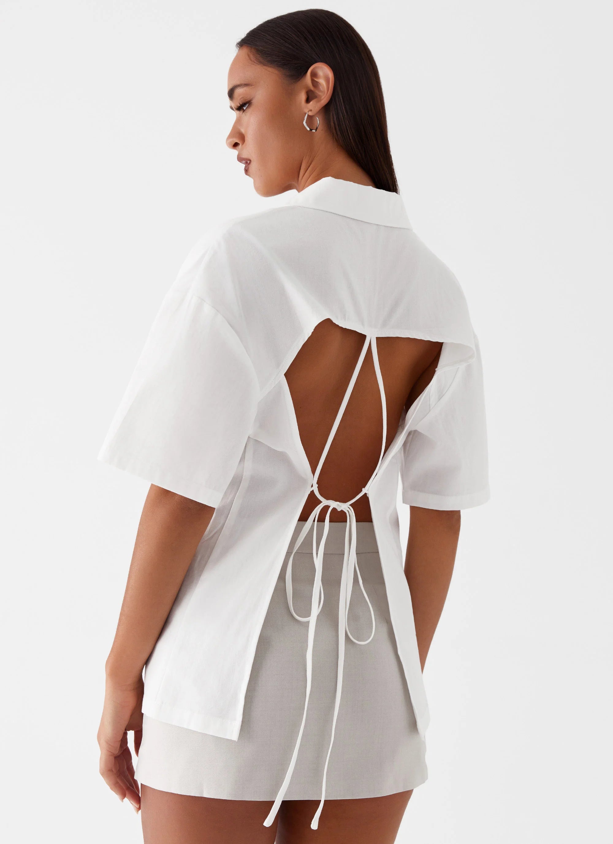 Introducing the Hadley Open Back Short Sleeve Shirt – featuring a classic double collar and front button closure for a polished look. The short sleeves and open back design add a contemporary twist, perfect for effortlessly transitioning from day to night.