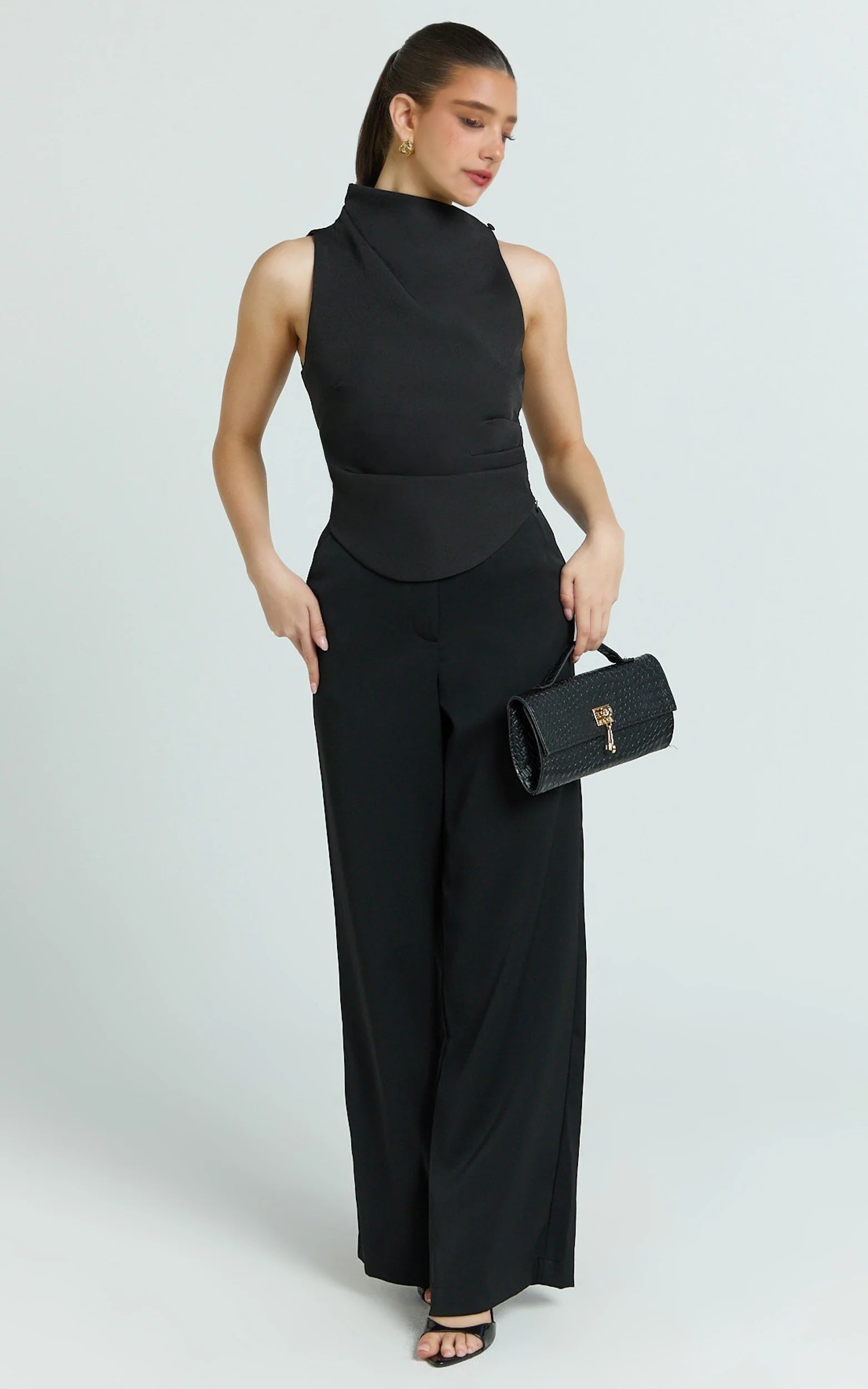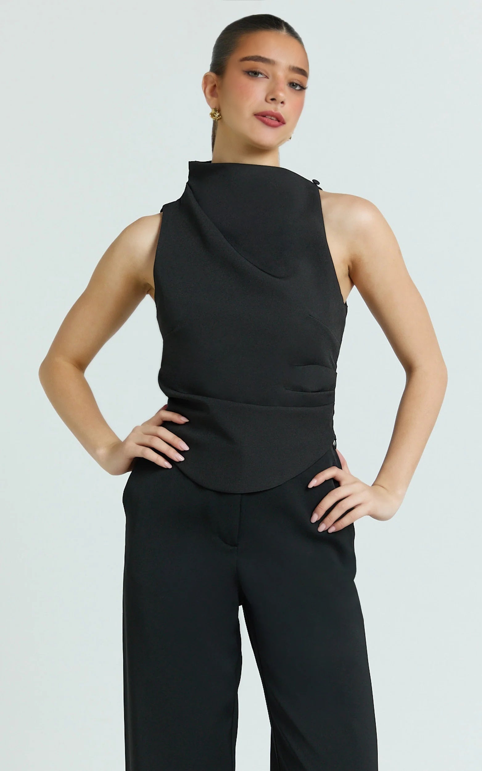 Introducing Harlene, your minimalist hero with a maximalism-ready twist, build contrast with statement jewelry or keep it pared-back and chic. Style the Harlene Top - Draped Tucked Neck Sleeveless Top In Black with closed-toe shoes for that refined finish, or lean into an evening vibe with glossy makeup and a sharp blazer. This is the black top you’ll reach for on repeat.