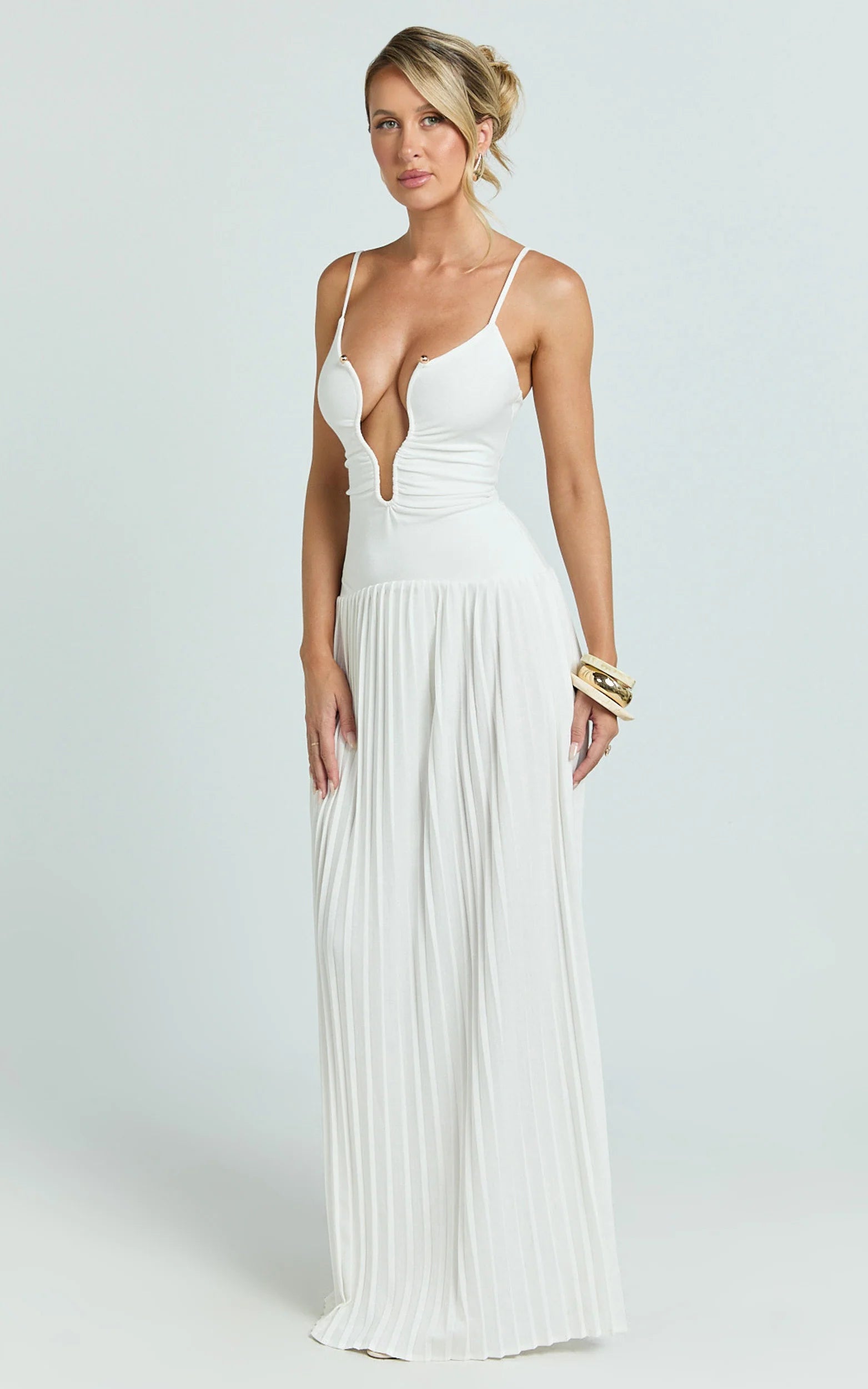 Hathaway Maxi Dress - U Shaped Neck Pleated Dress In Ivory is your cue to get glam without the stress. Slip in, glow on, and let the compliments find you.