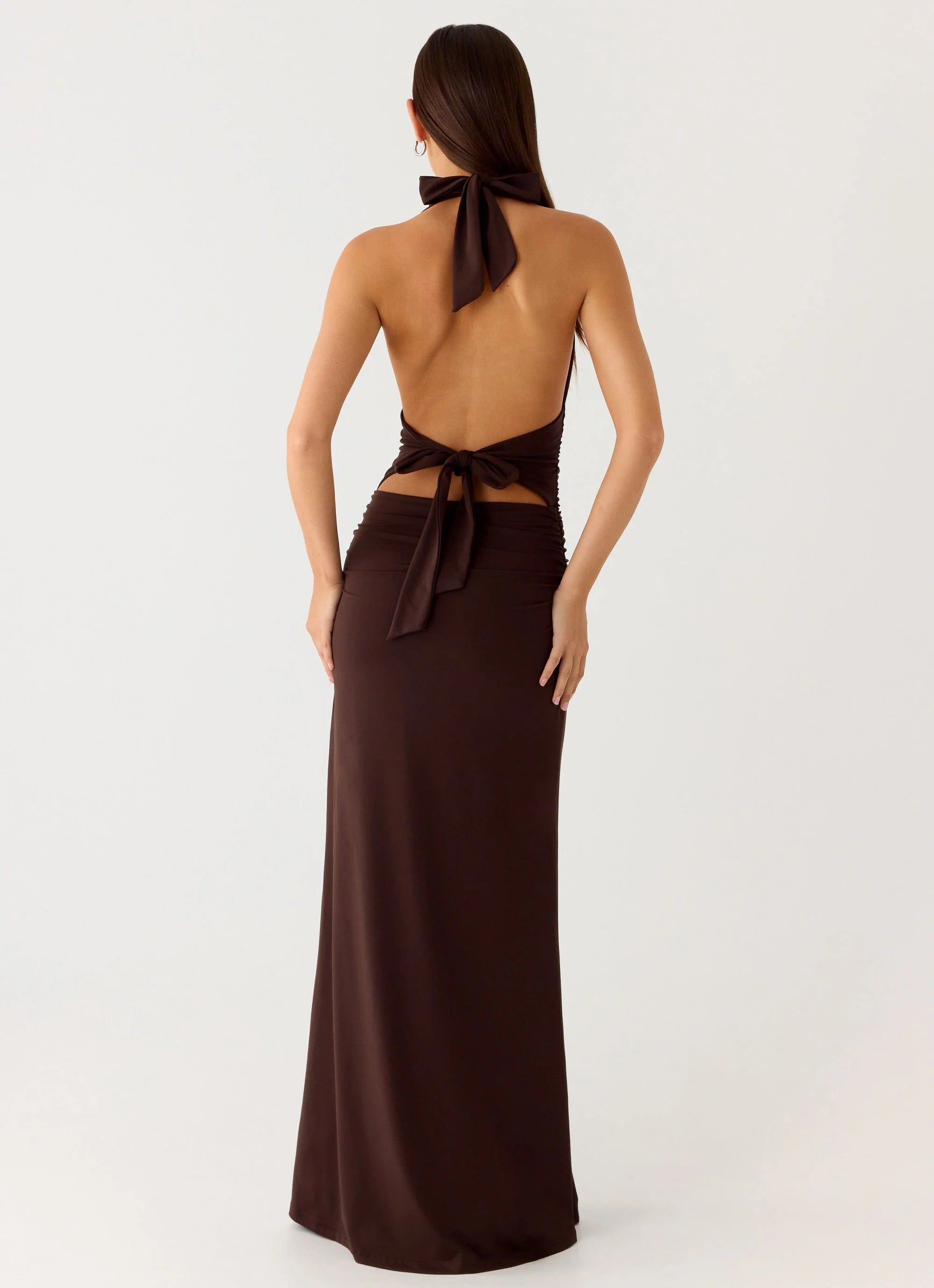 The Ilaria Halter Maxi Dress is a chic and versatile maxi featuring a V neckline, ruched detailing under the bust and along the sides, and a low back with a back tie for a flattering fit.