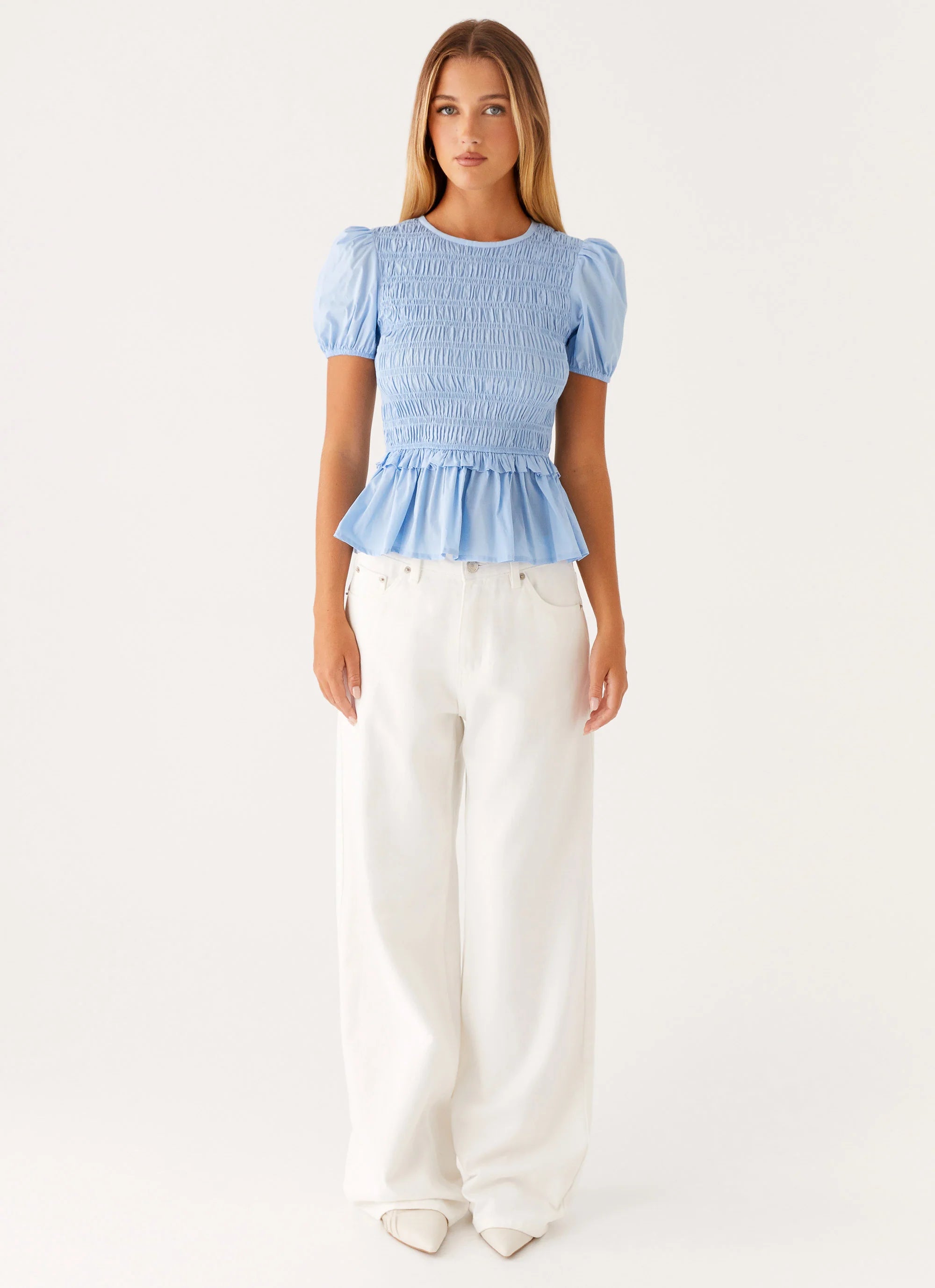 Izzy Shirred Top – A perfect blend of comfort and style. The crew neckline and shirred bodice create a flattering, fitted look, while the flared hemline adds a playful touch. Ideal for creating effortless elegance, day or night.