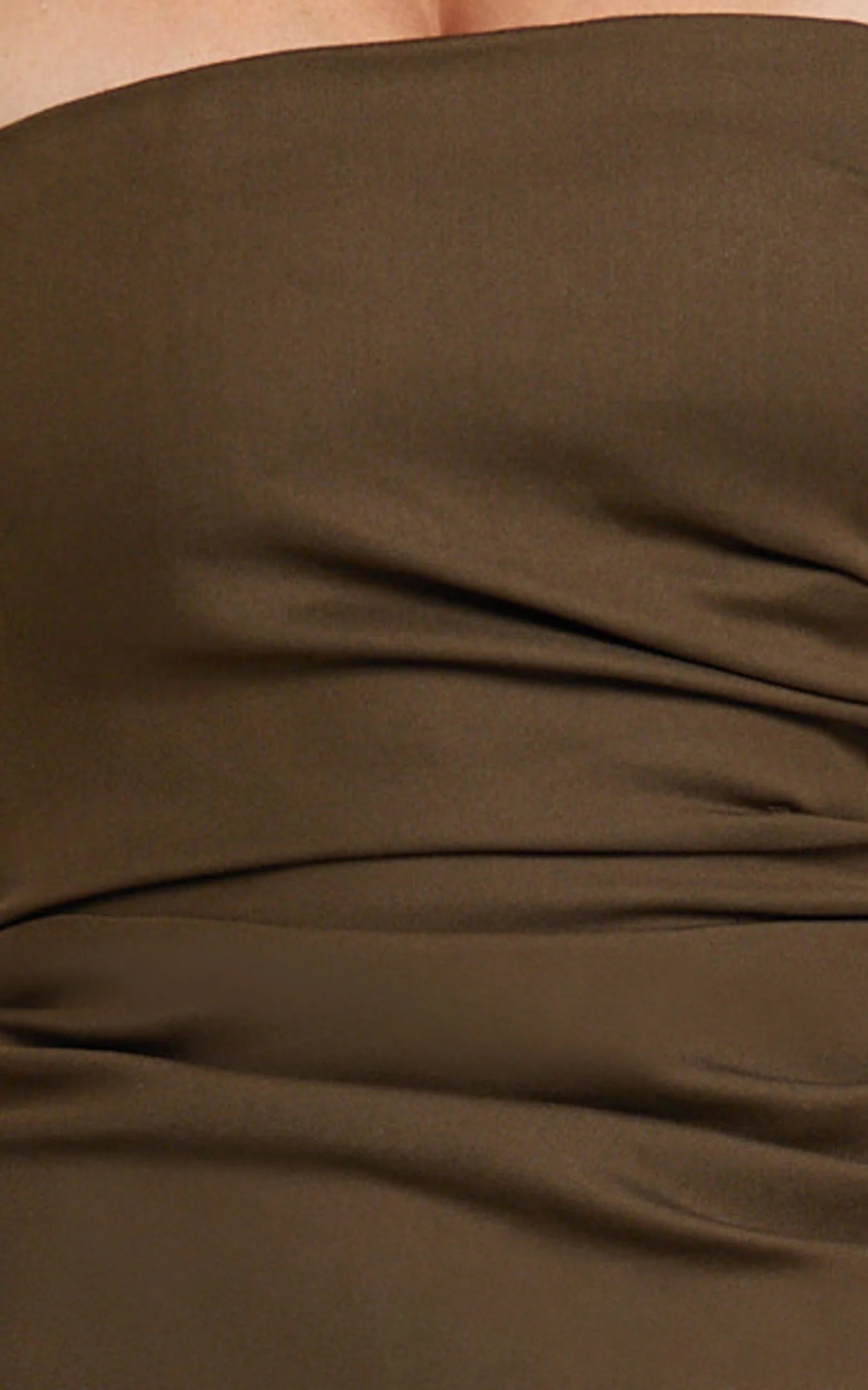 This strapless, ruched column silhouette sculpts, smooths and serves effortless confidence from dinner plans to dance floors. The fitted maxi length creates a long, lean line while the ruching flatters every curve, because Dresses should love you back.