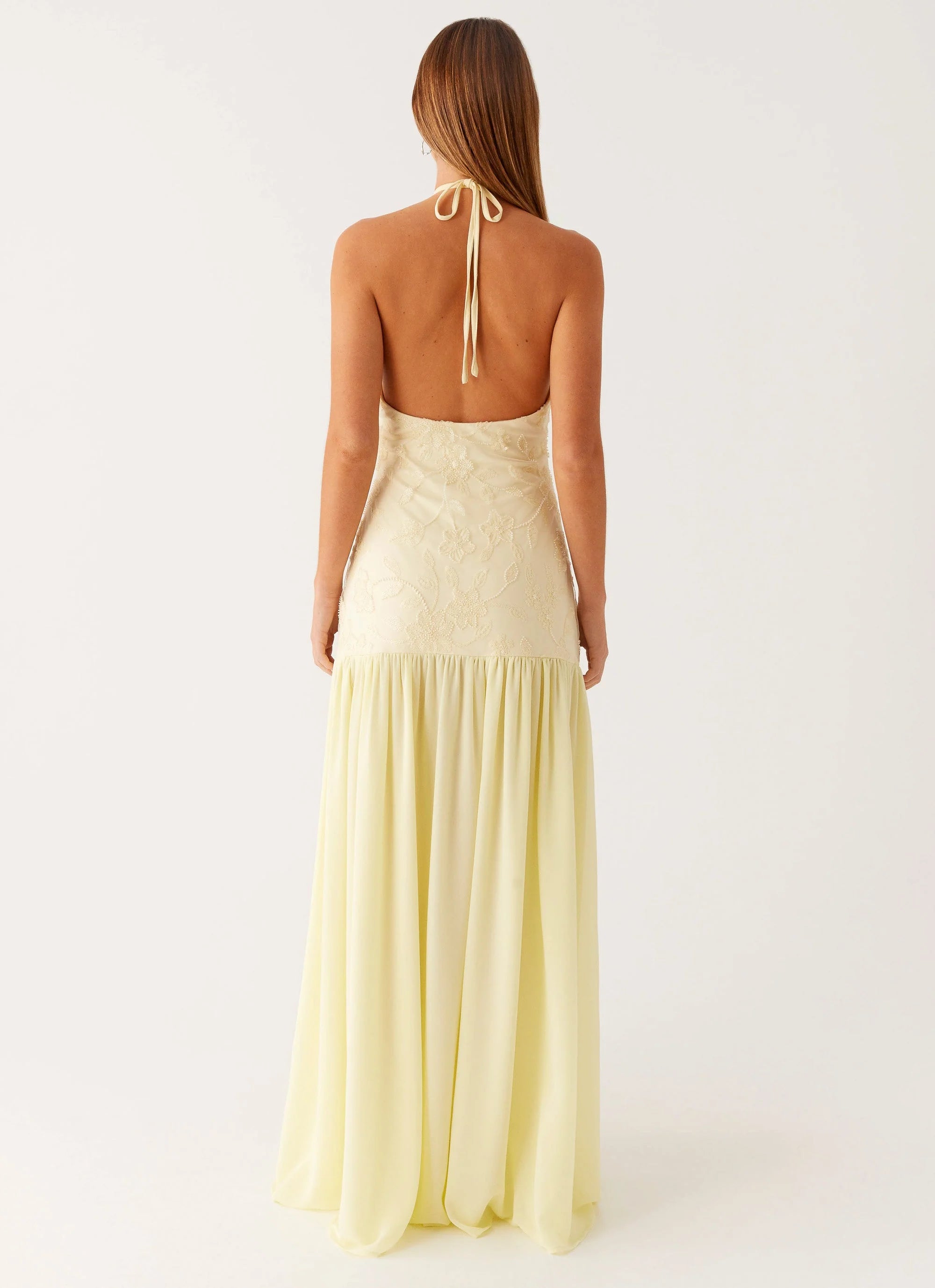 The Janelle Beaded Maxi Dress is a standout for golden hour to after dark, featuring a halter neckline with thin neck tie straps and an asymmetrical drop waistline. The beaded bodice adds luxe texture, paired with an open back for bold allure.