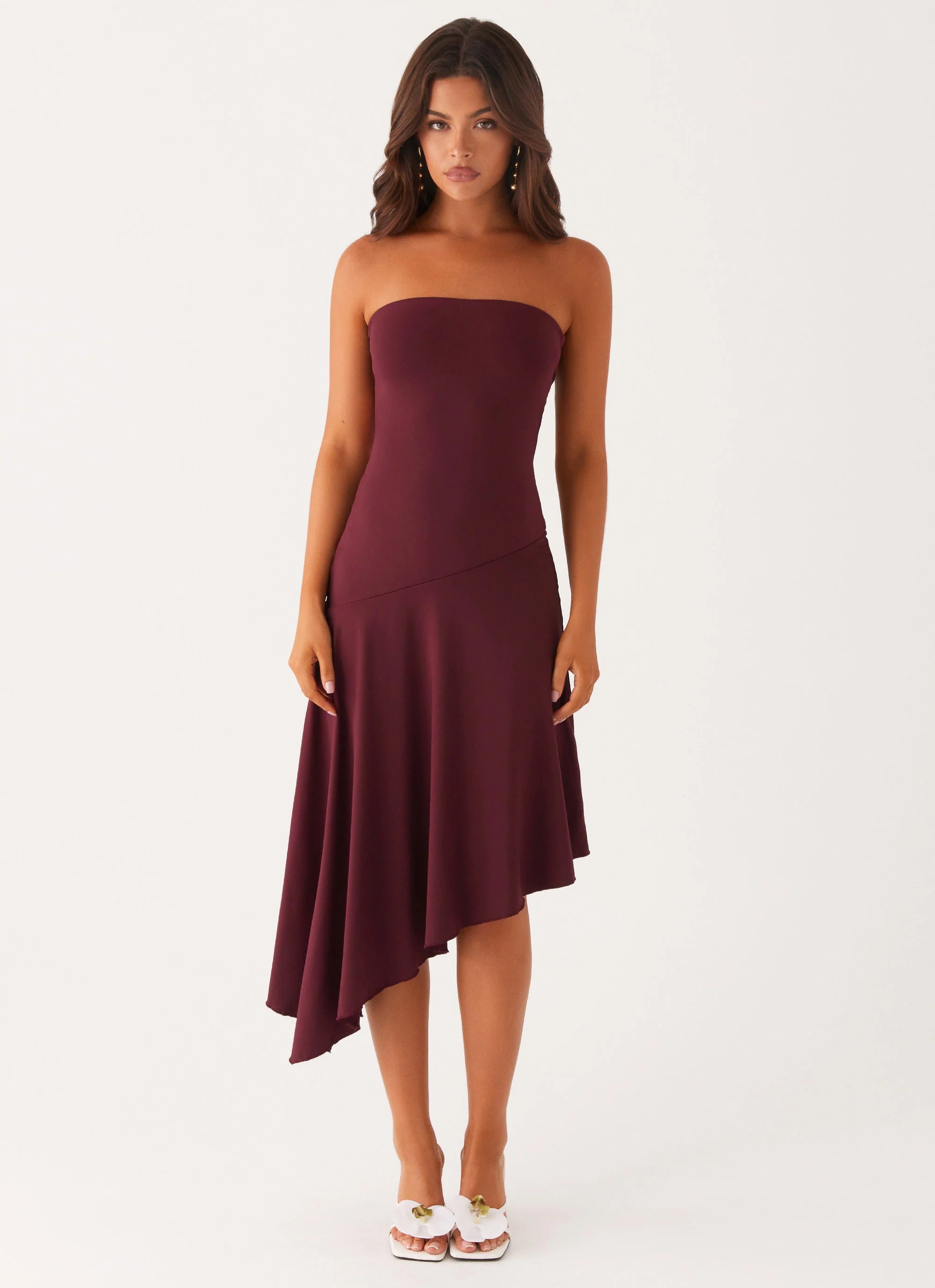 The Juliana Midi Dress is bold and sophisticated. Featuring a midi length, back cutout, and strapless neckline, it’s made for golden skies and nights where elegance meets daring style.