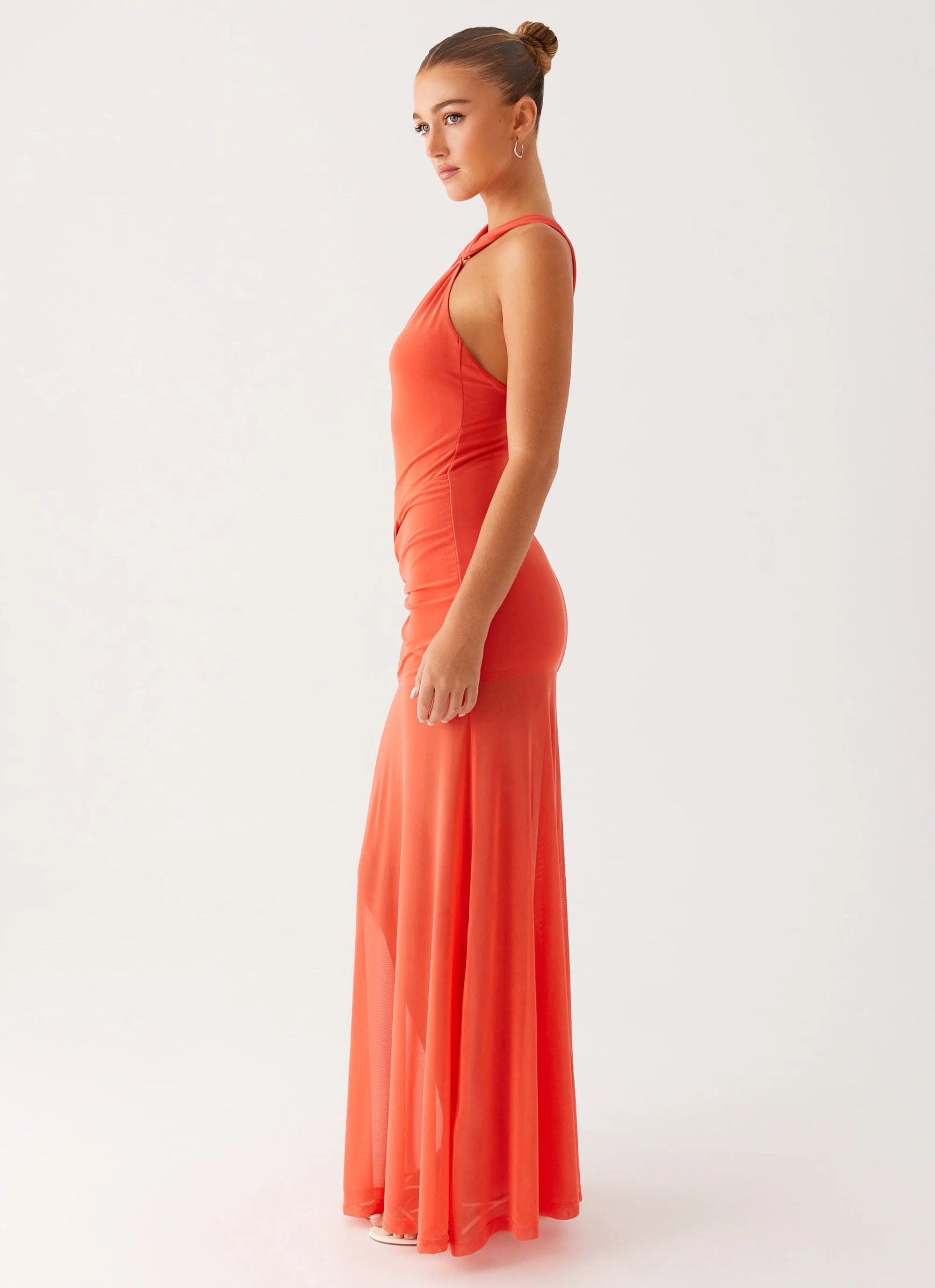 The Kavala Maxi Dress in coral features a striking one-shoulder neckline with a circular ring attachment and gathered details at both the neckline and hip. With a low back and maxi length, it’s partly lined for a comfortable fit that transitions effortlessly from day to night.