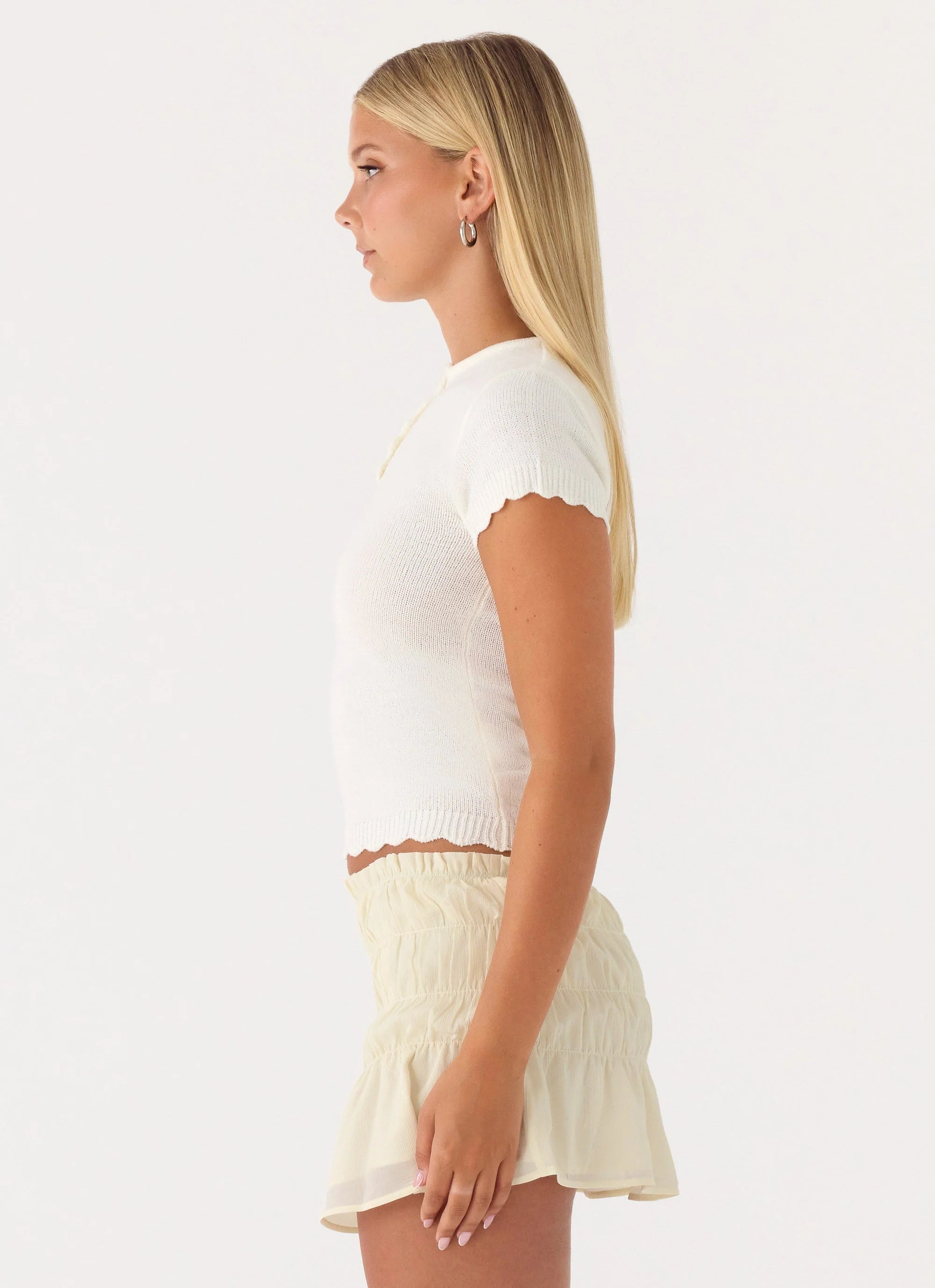 The Kerrigan Knit Top is made for breezy afternoons that transition effortlessly into evening glow. Featuring cap sleeves and delicate button detailing, this fitted silhouette is finished with scallop trim for a feminine, editorial touch. Crafted in soft knitted fabric, it’s a statement of relaxed, sophisticated style.