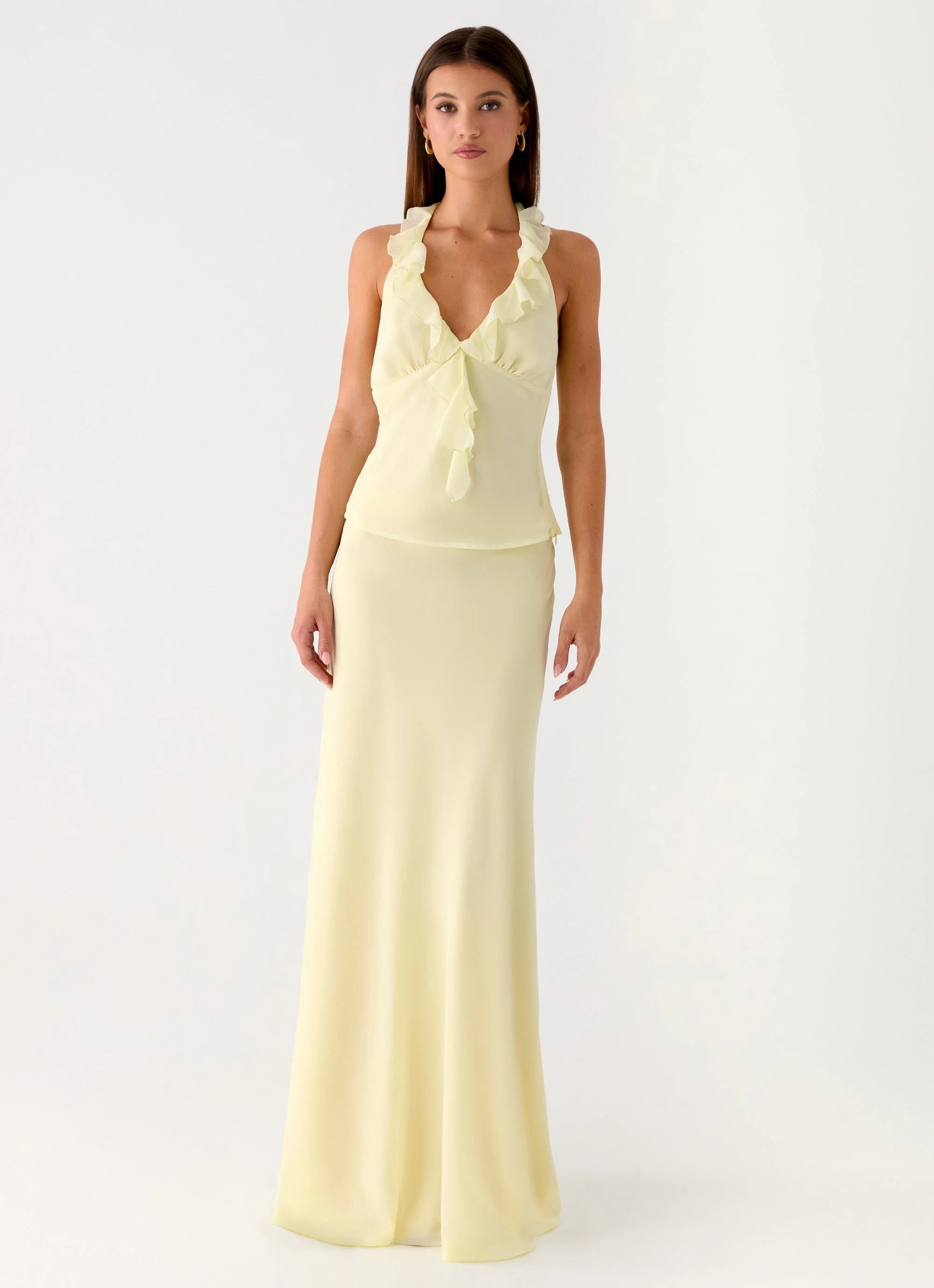 The Log In Halter Top is made for effortless summer evenings and sunset-ready moments. Featuring a low V neckline with ruffle trims and a halter design, this fully lined piece is finished with an adjustable thin strap and low back for a flirty, feminine silhouette. Flowing with soft chiffon, it’s ideal for beach-to-bar styling.
