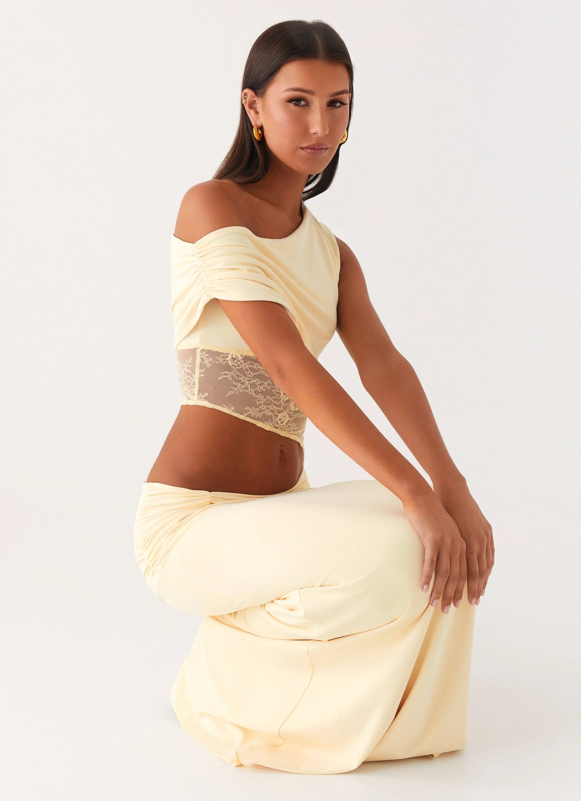 The Love Motion Maxi Dress is made for nights that linger under golden skies. Featuring an off-the-shoulder neckline with a bustier and fully lined skirt, this maxi combines stretch jersey with sheer lace panels and an asymmetrical bodice cutout for a flirty, editorial finish. Designed to move with you, it’s the perfect statement piece from sunset to after-dark.