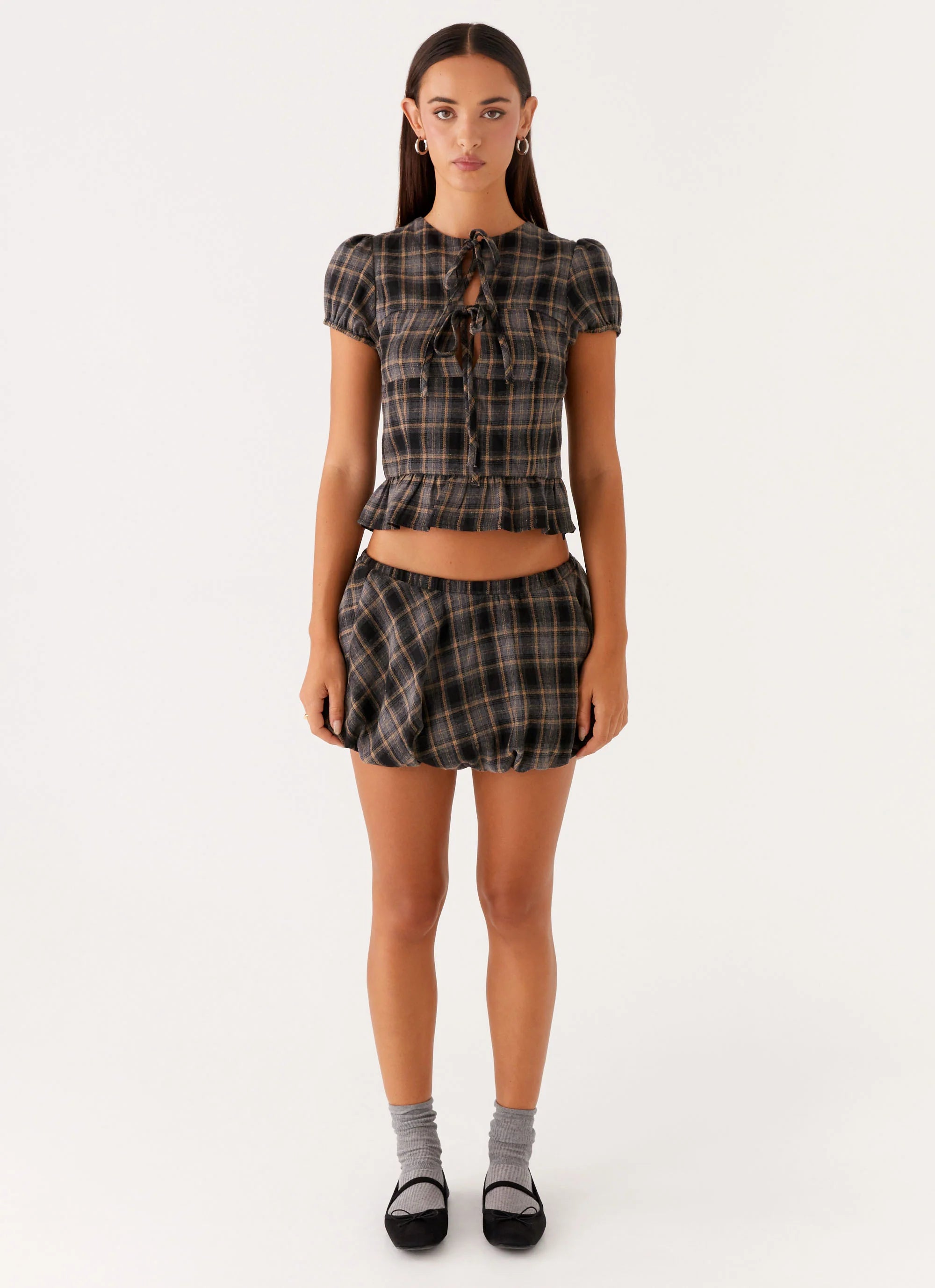 The Lucia Puff Sleeve Top brings playful elegance with its balloon sleeves and frilled hemline. The classic crew neckline adds a refined touch, making it perfect for day-to-night styling with a soft, feminine flair.