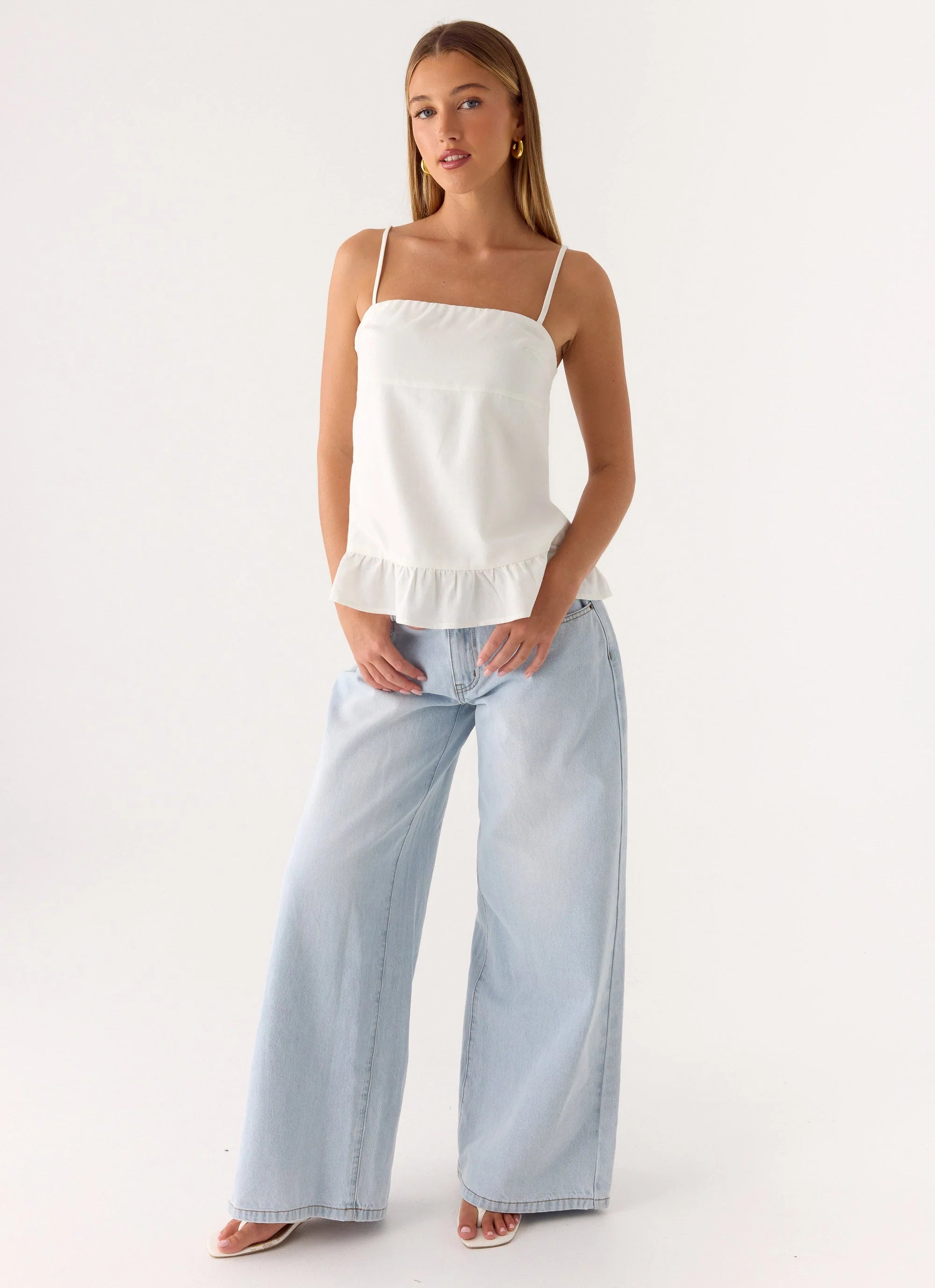 The Lucie Mae Top is made for golden skies and nights that linger long after sunset. Designed with a flattering square neckline and a softly structured silhouette, this piece balances femininity with effortless ease. Finished with adjustable straps and a ruffled hemline, it’s a warm-weather staple with a refined, after-dark edge.