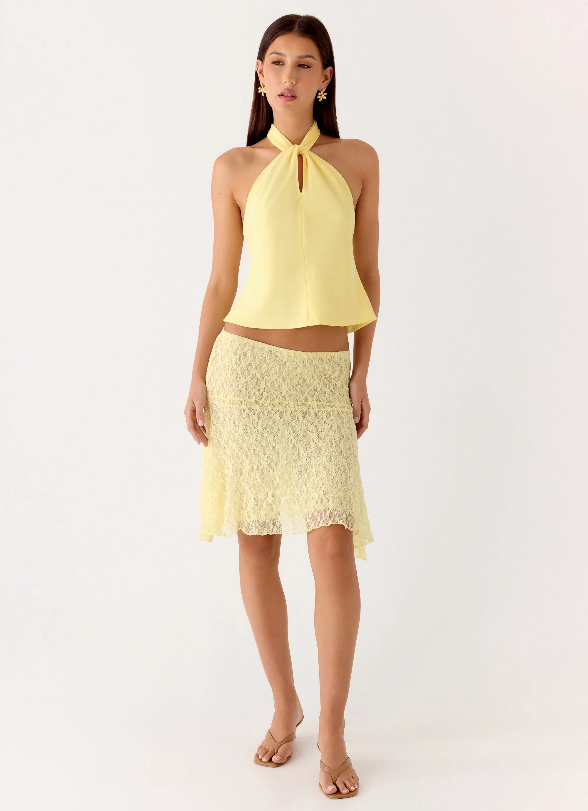 The Maddox Scarf Top is a chic and flirty pick for sun-soaked days or balmy nights. With a halter neckline, front keyhole, and open back with tie details, it pairs scarf accents with a flowing, lightweight silhouette for effortless summer style.