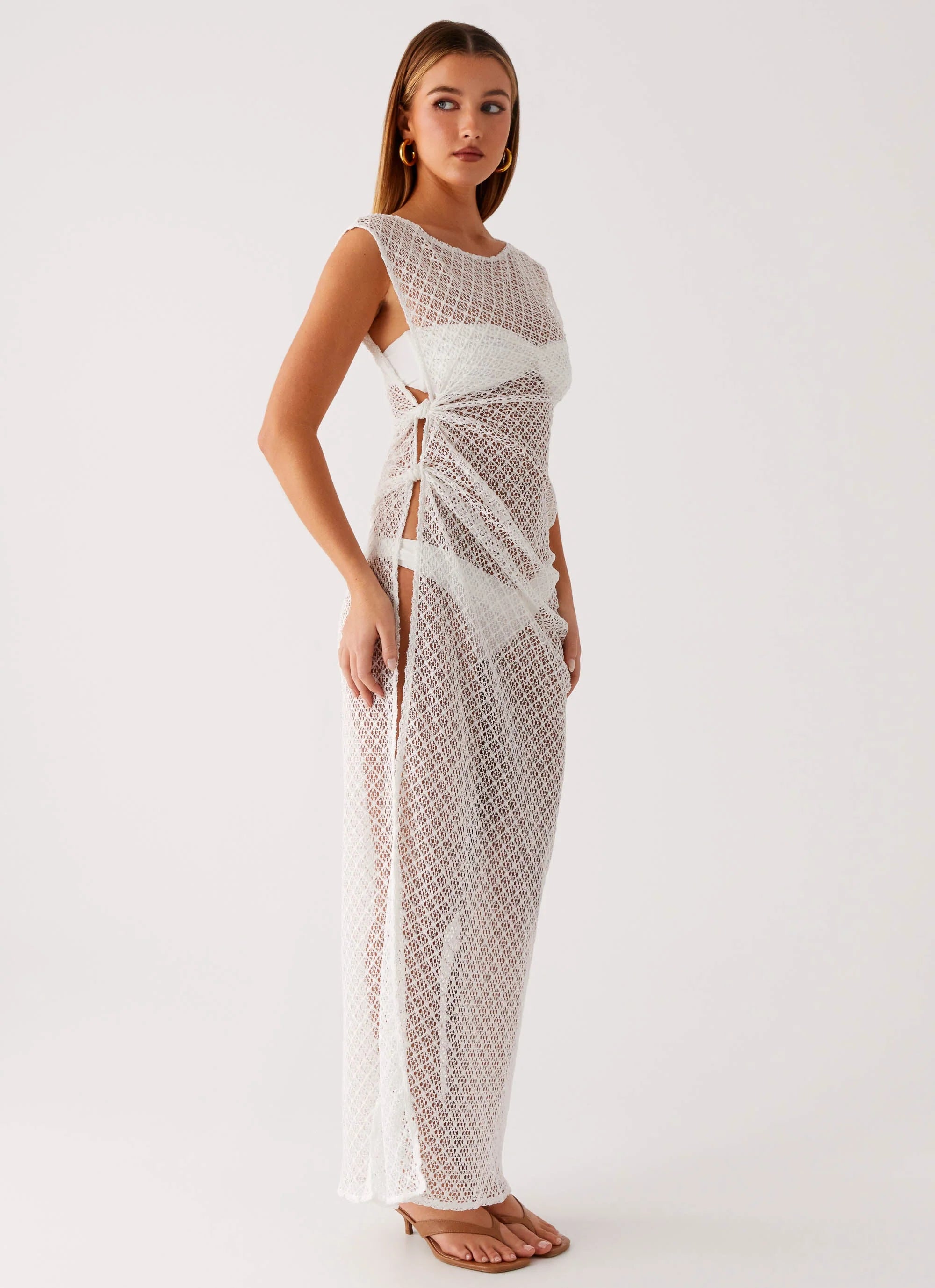 The Maeva Maxi Dress is your effortless swim cover-up with a twist. Crafted from semi-sheer knitted material, it features a maxi length, rounded neckline, open knotted side, and a side split for easy movement. Unlined and breezy, it’s perfect to throw on over your swimwear and step into sunset vibes.
