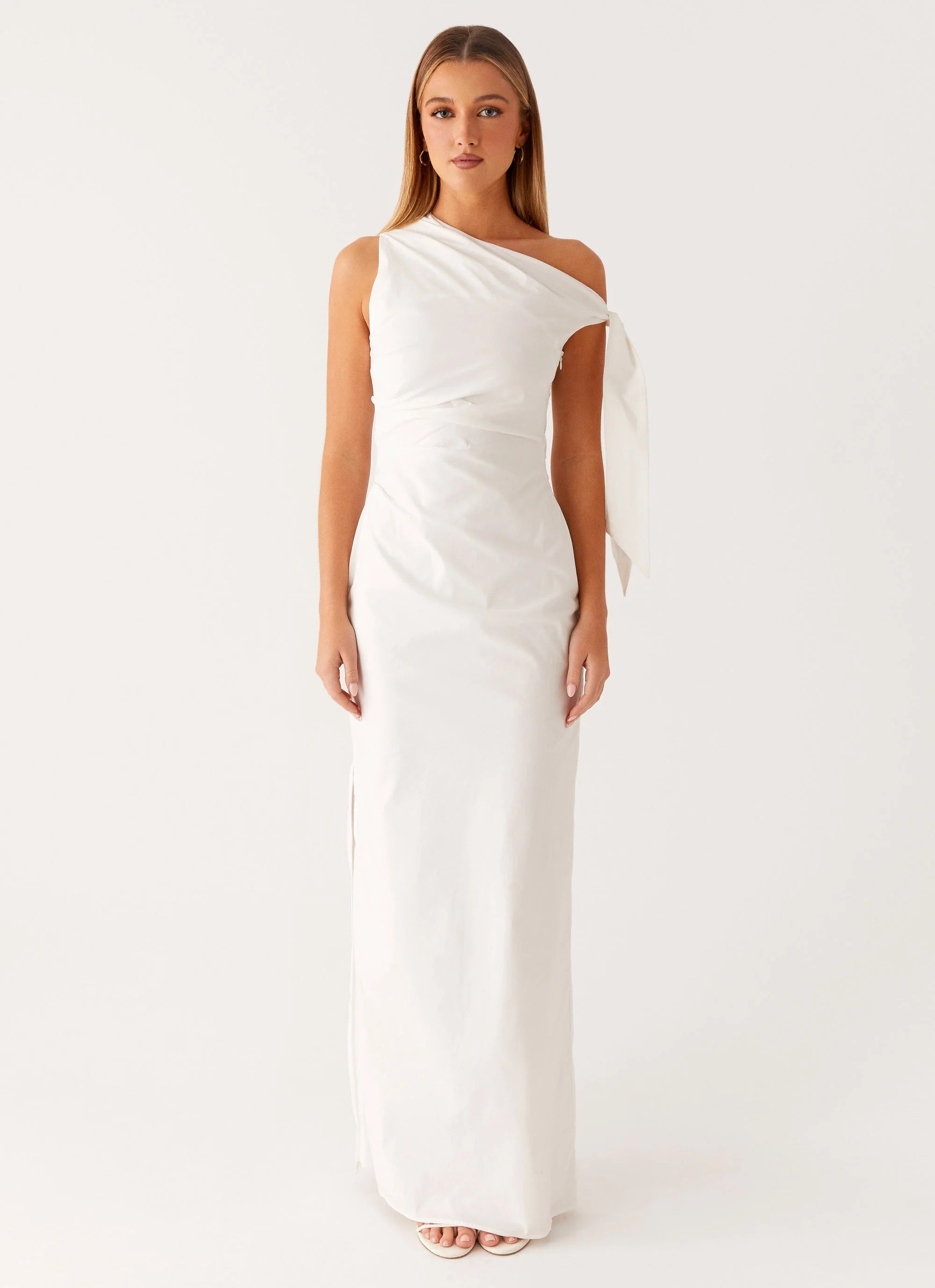 The Marella Maxi Dress features an asymmetrical neckline with a stylish side shoulder tie. Designed with ruched sides and shoulder seams, this fully lined dress offers a flattering silhouette. Finished with a side hook and eye and invisible zipper for a seamless fit.