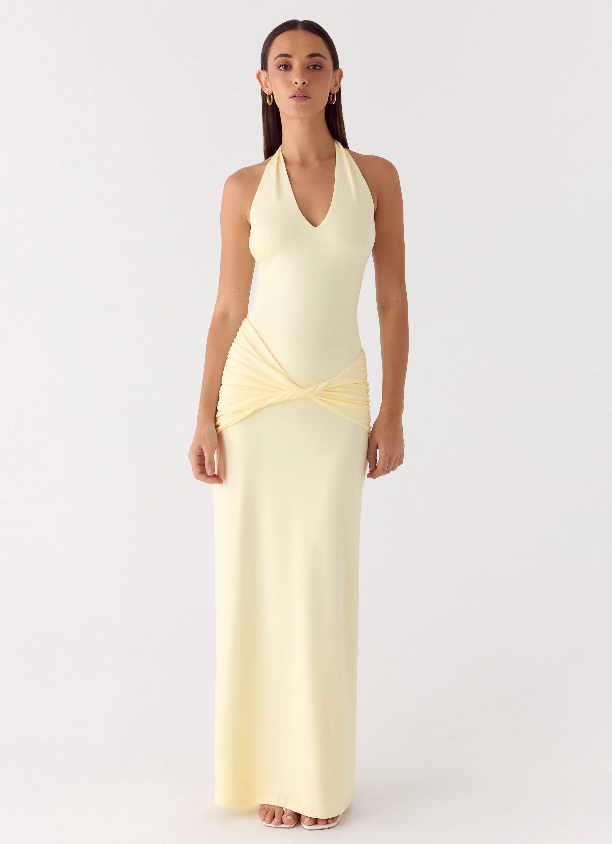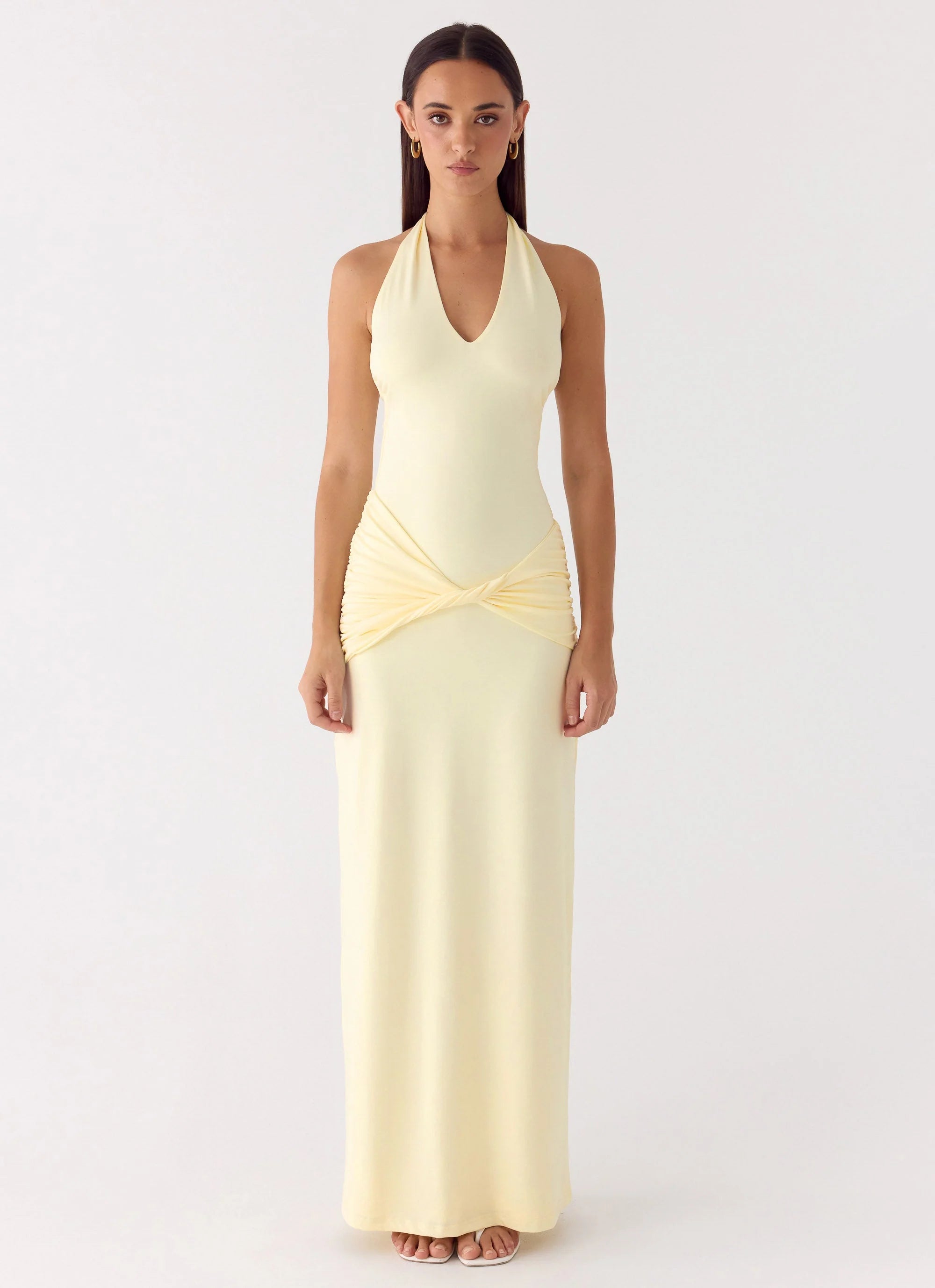 The Maribelle Maxi Dress is made for evenings that flow effortlessly from golden hour to after-dark sophistication. Featuring a low V-neckline with front twist detailing and an open back with thick adjustable straps, this maxi-length style skims the body in soft stretch jersey for a flattering, confident fit. Fully lined for comfort, it’s an editorial-ready silhouette perfect for warm nights.