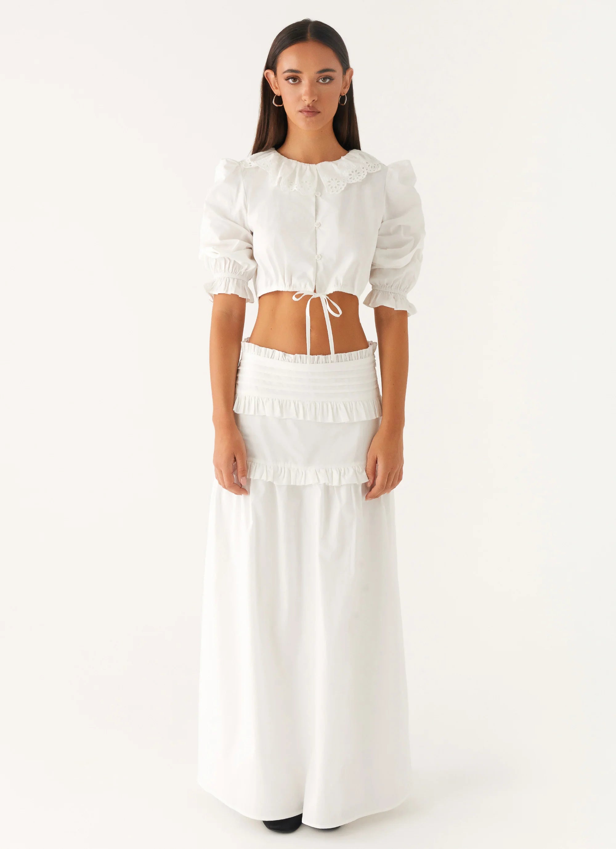 The Melania Blouse is bold and breezy. Featuring a cropped length and balloon sleeves, it’s designed for those golden skies and nights where effortless style takes center stage.