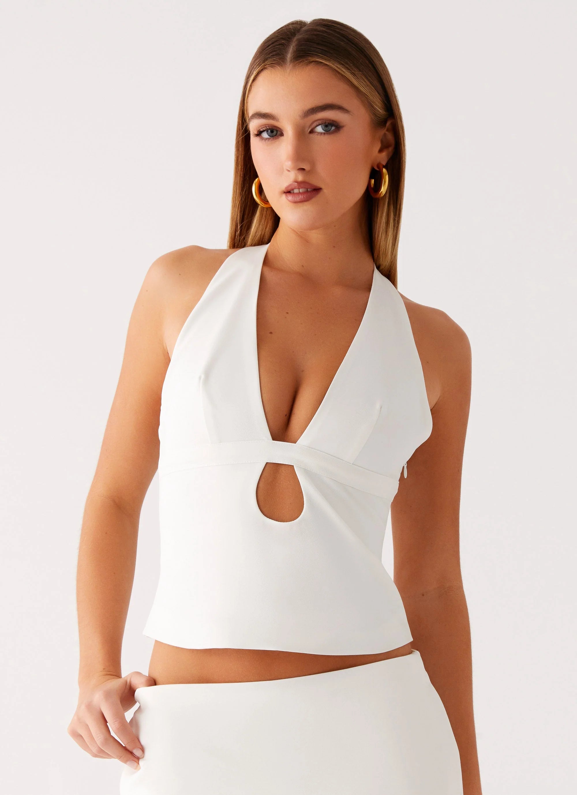 The Mirna Halter Top features a chic V neckline with front ribbon detailing and a stylish front keyhole cut out. Fully lined for comfort, it includes a neck strap, back button, and side hook and eye with an invisible zipper for a perfect fit.